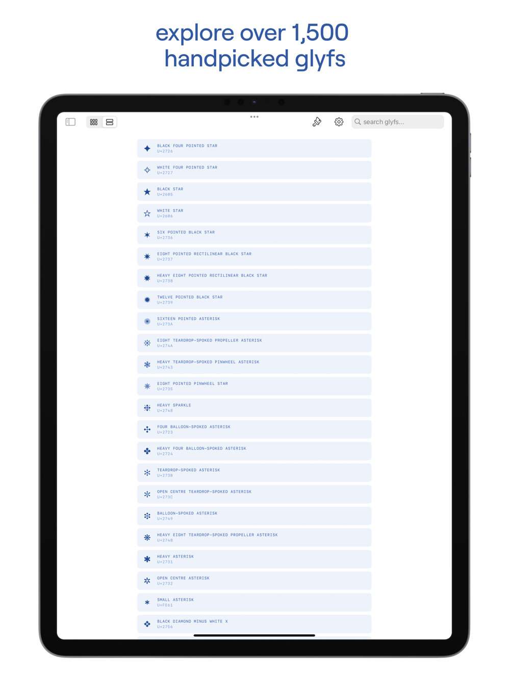 With glyfs, you can copy & paste or drag & drop characters, explore curated collections, search for symbols and add them to favorites. The app also features a comprehensive suite of text tools to boost your productivity.