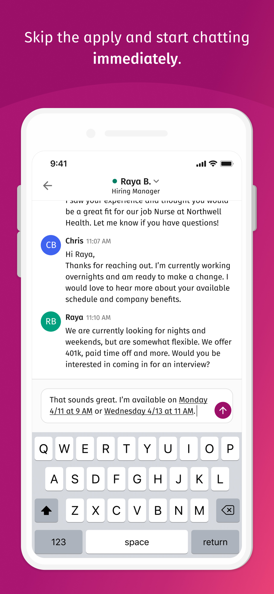 Job or candidate seem like a great fit after a bit of conversation? Discuss next steps for interviewing and applying within your chat and get one step closer to the hire.