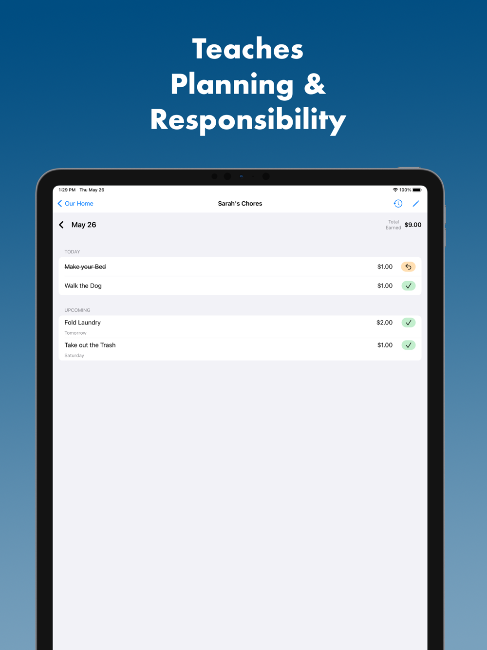 Create profiles for each family member and keep track of what they've done and how much they've earned. You can use built in avatars or photos, and setup each device based on profiles so the right person get's reminders.