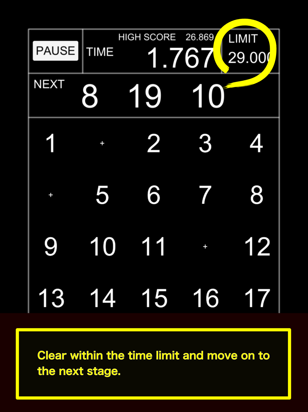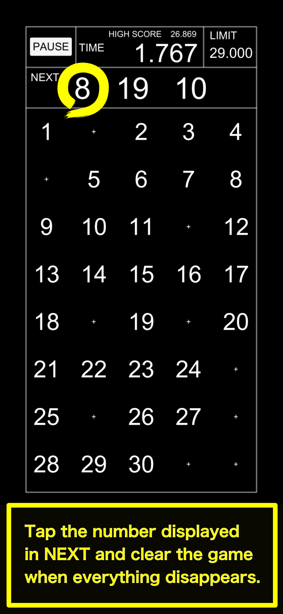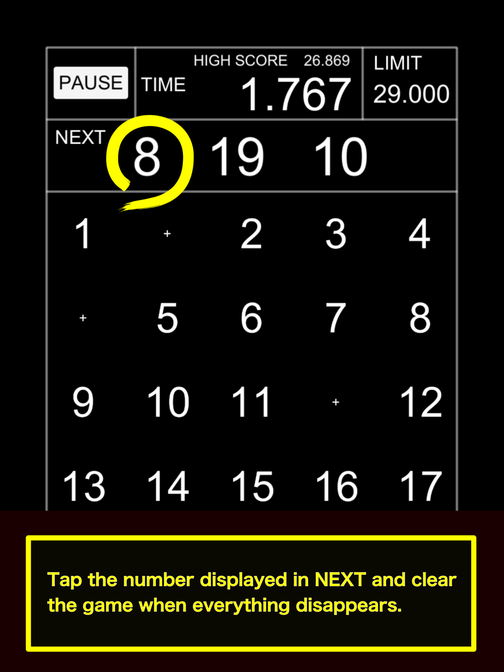 You can clear the game by tapping the number displayed in "NEXT" and erasing everything. It is a game that challenges how fast you can clear.