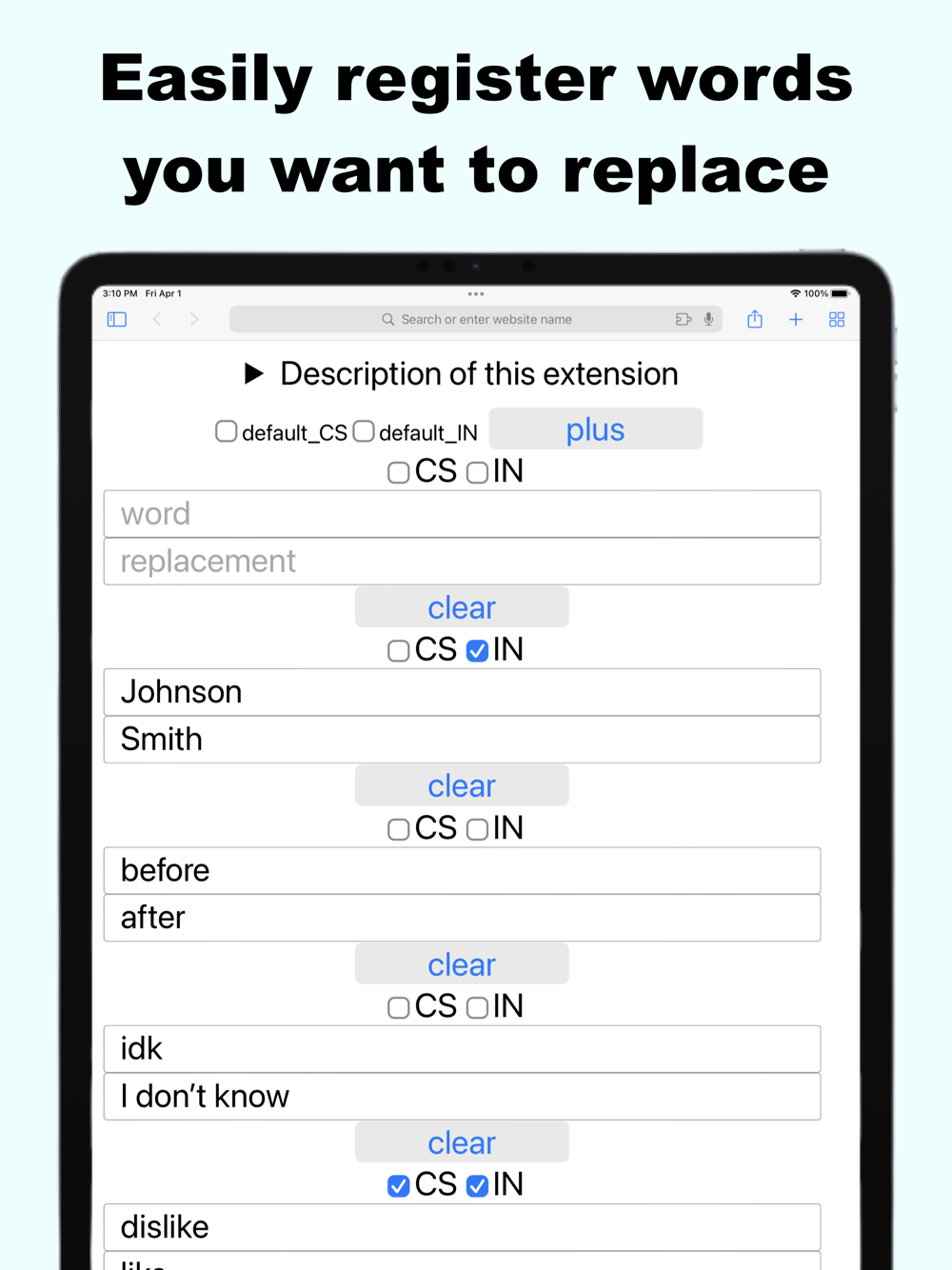 2. Open the word settings screen in Safari and set the word you want to replace (enter it in the field marked "word") and the word you want to display (enter it in the field marked "replacement").