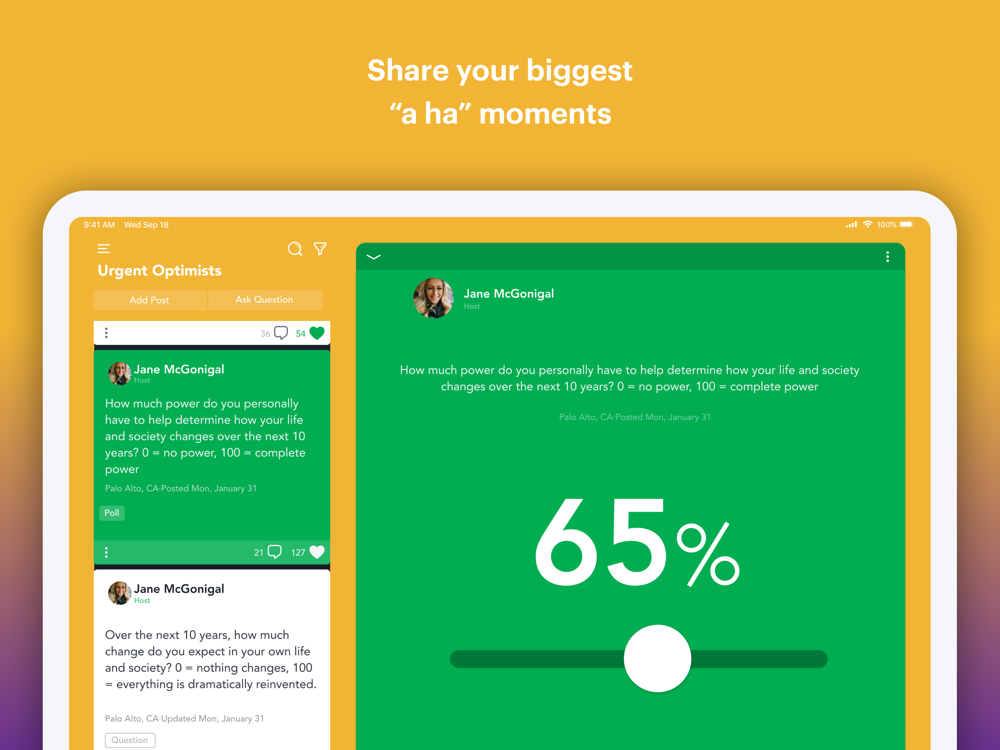 PLUS all the social networking features you need to make deep, lasting connections with urgent optimists from around the world -- including group chat study groups to support your imagination training, a forum to share and get feedback on your own future scenarios, direct messaging, and customizable profiles to tell the world what futures you want to help make.