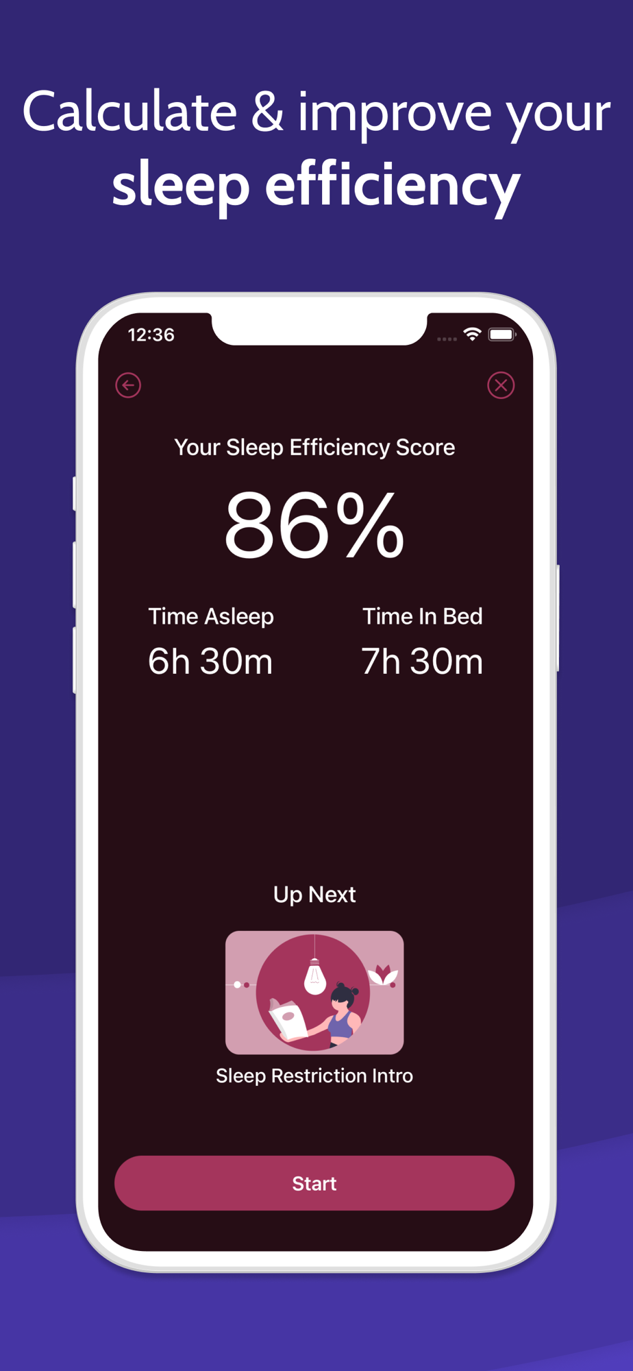 Restful teaches advanced techniques such as sleep restriction, sleep windows, stimulus control, sleep hygiene, relaxation techniques, and cognitive restructuring. Record your sleep diary each day to get your sleep efficiency score and track events influenced your sleep quality. After each entry, do one lesson and over the course of several weeks, complete the whole course to optimize your sleep efficiency.