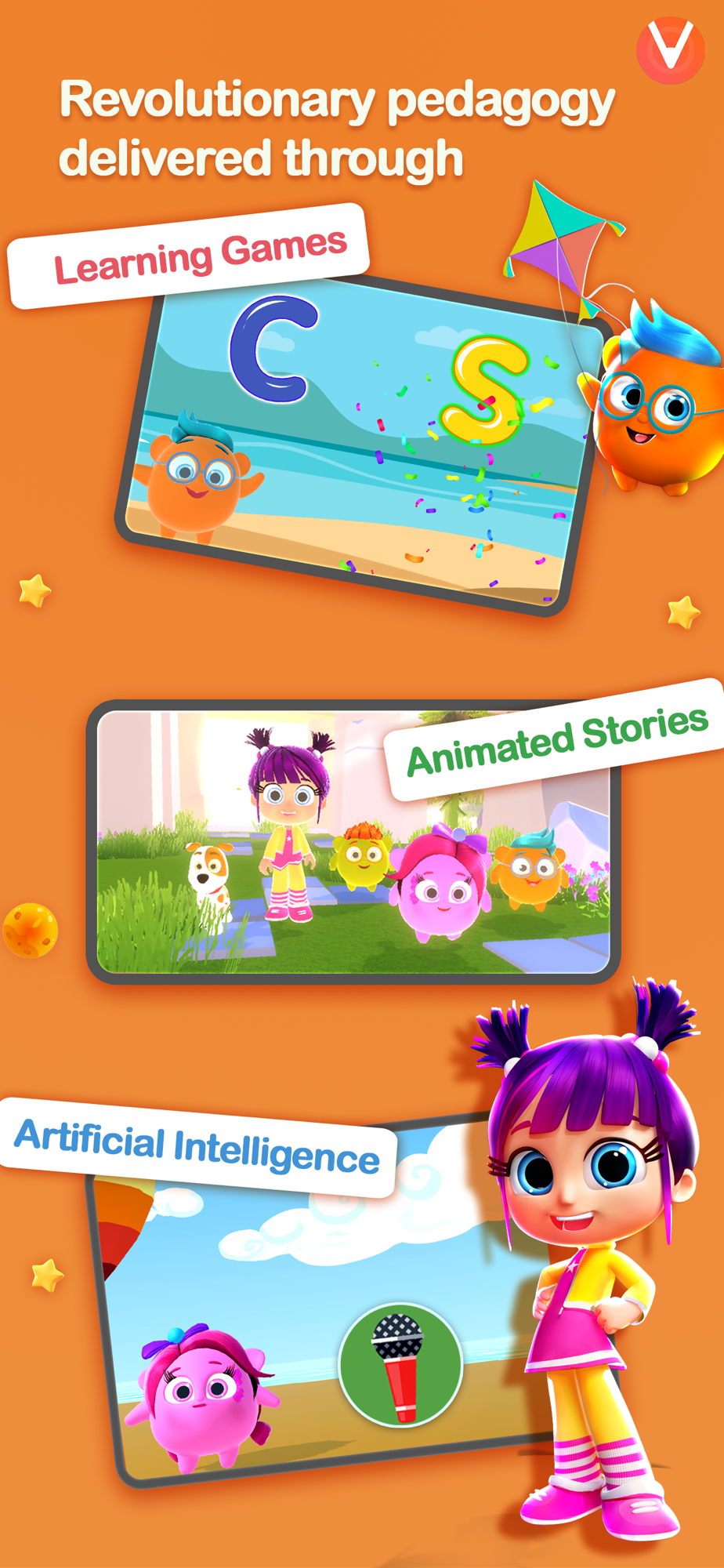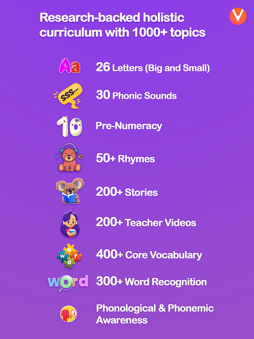 The curriculum includes 1000+ new words, Phonic sounds, Letter names, identifying big and small letters, various flashcards, rhymes, and graphical stories. Our speech AI feature enables kids to speak words, letter names and phonic sounds. All in just 15 mins a day, and that too they will learn independently.