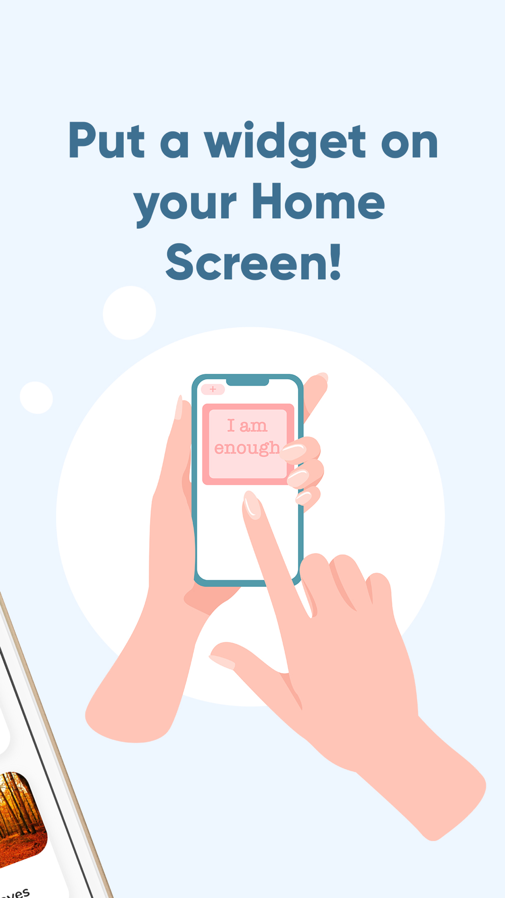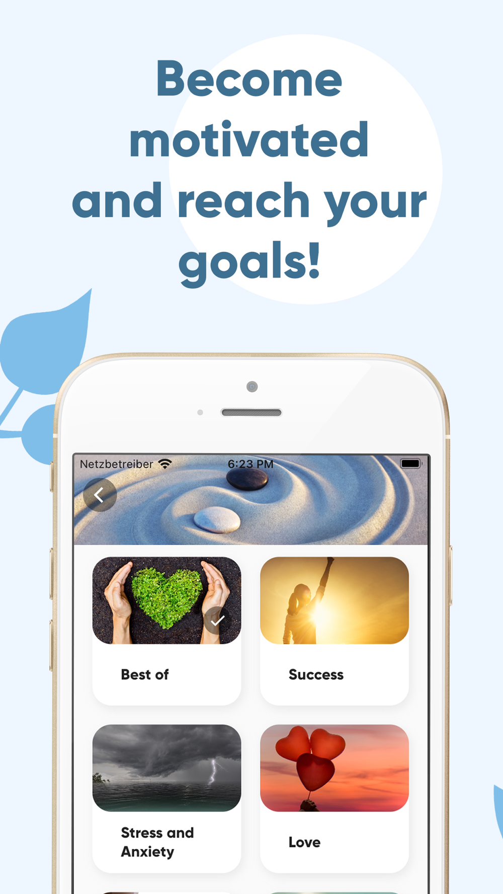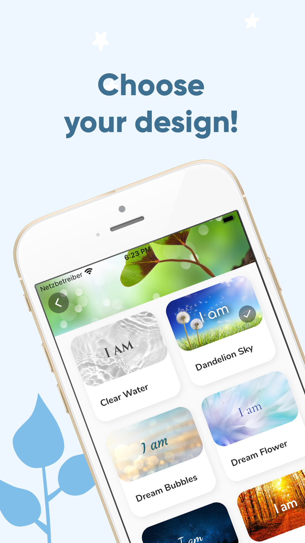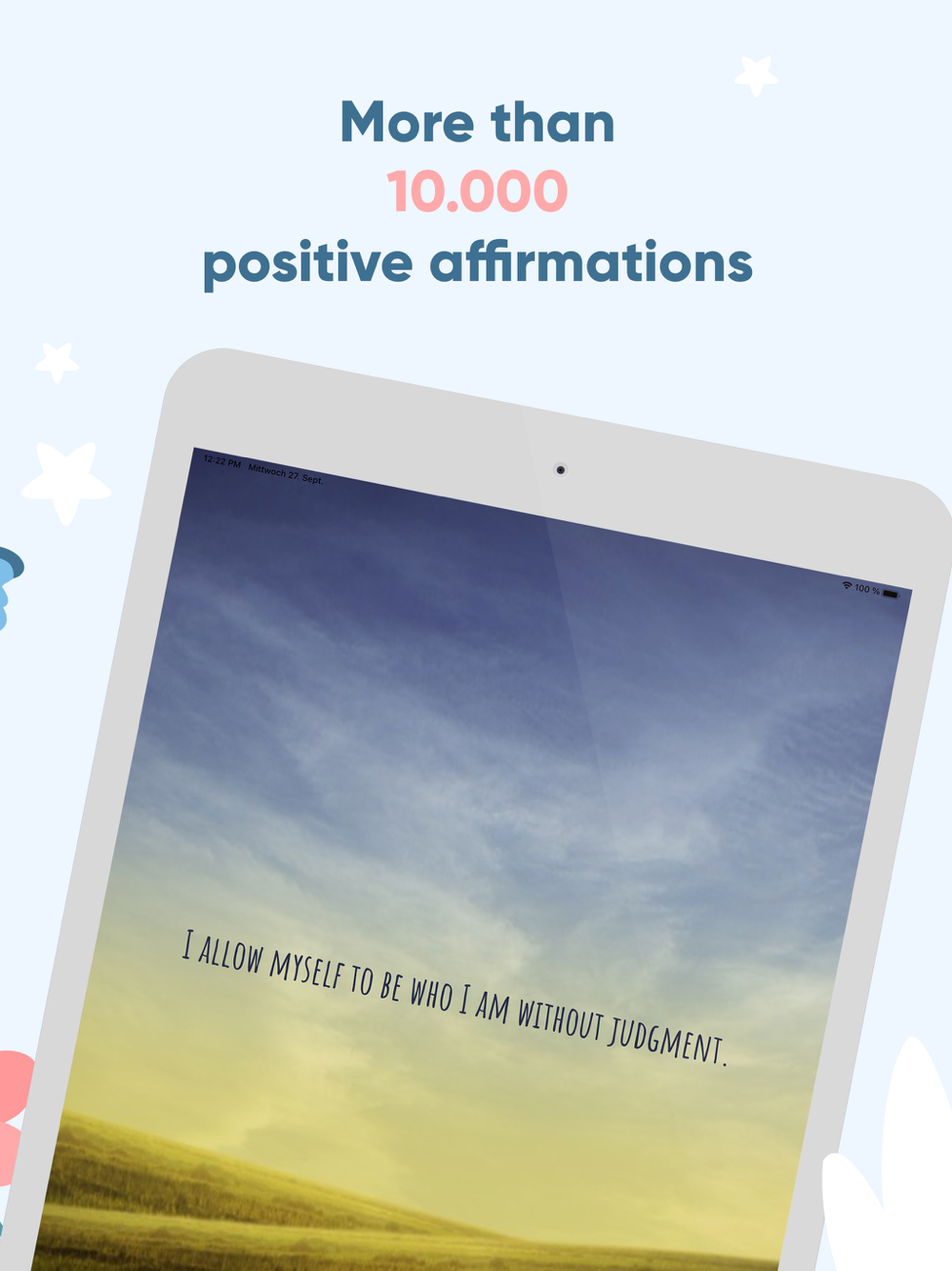 Receive daily affirmations to increase your positivity in life. Integrate motivation and self-love into your life with ease - with I am. Achieve your wishes and goals - with more than 10,000 affirmations. Control with your thoughts not only what you feel, but also what you do! Let go of worries and old thinking patterns and create space for a positive way of thinking and acting. You can choose between different areas (e.g. love, wealth, success, motivation, stress and anxiety, self love, health…) to get daily affirmations according to your personal needs and your personal positivity development.