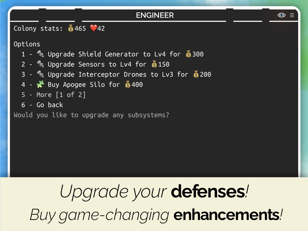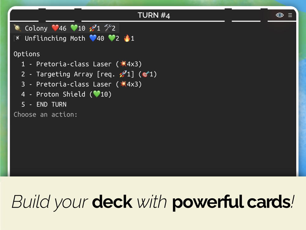 Colony is a text-based deck-builder RPG. Set far in the future, your mission is to terraform an uninhabitable rock into a lush paradise. Along the way, you will encounter space pirates, kind travelers, galactic royalty, and more! Build a deck of powerful lasers, missiles, and squads to defend your Colony from all kinds of threats.