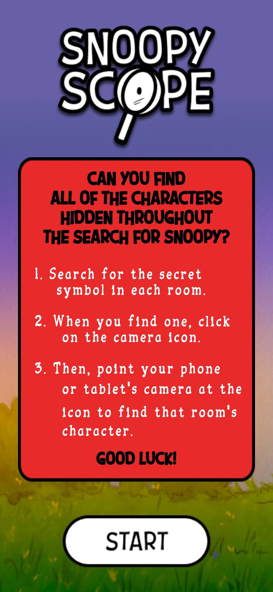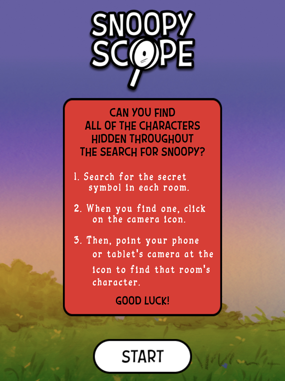 The Search for Snoopy SnoopyScope app is the official augmented reality companion app to The Search for Snoopy - A Peanuts Adventure. Use this application to solve the Snoopy Puzzle, and discover the seven hidden Snoopy alter egos found in rooms of The Search for Snoopy.