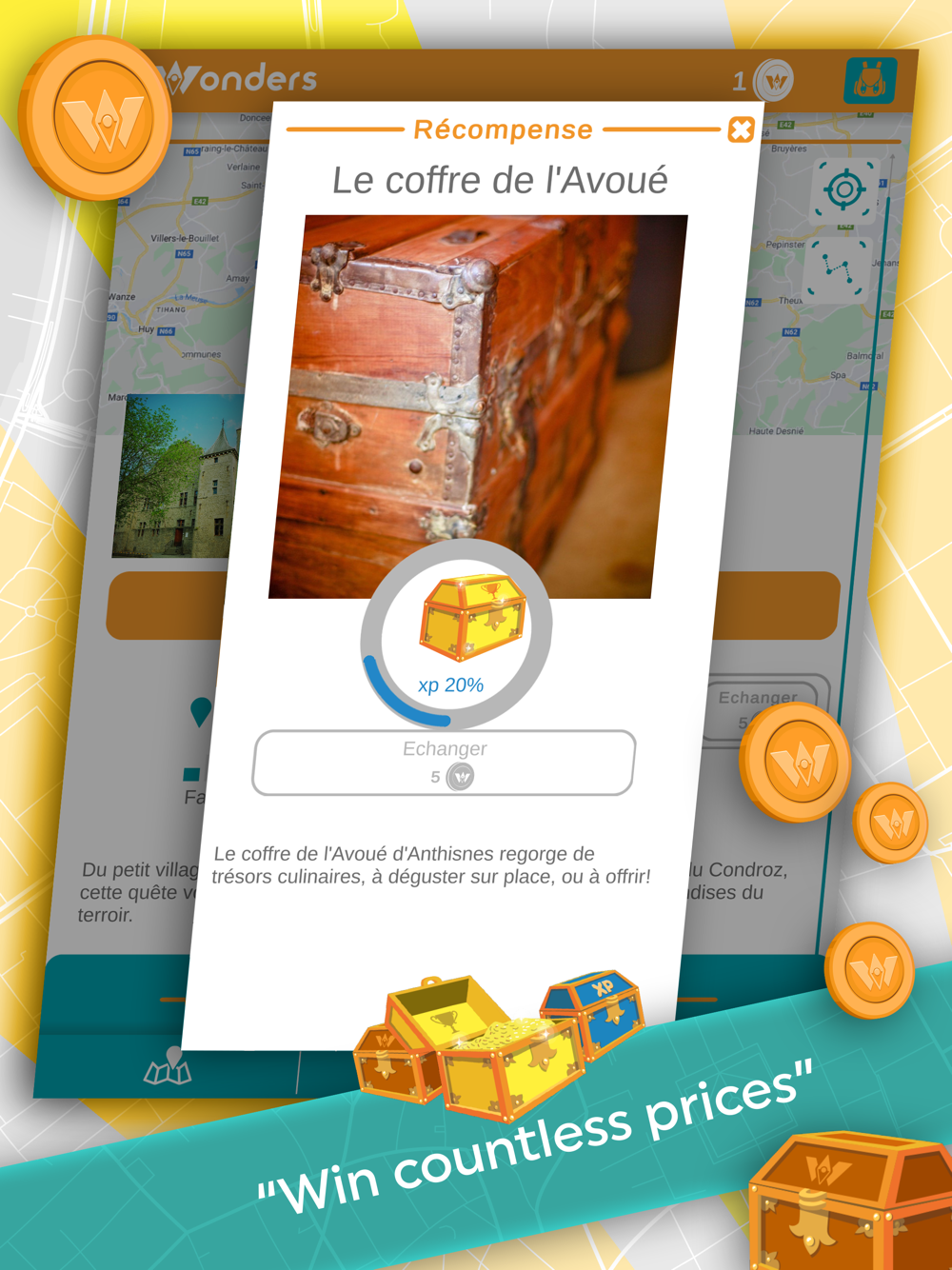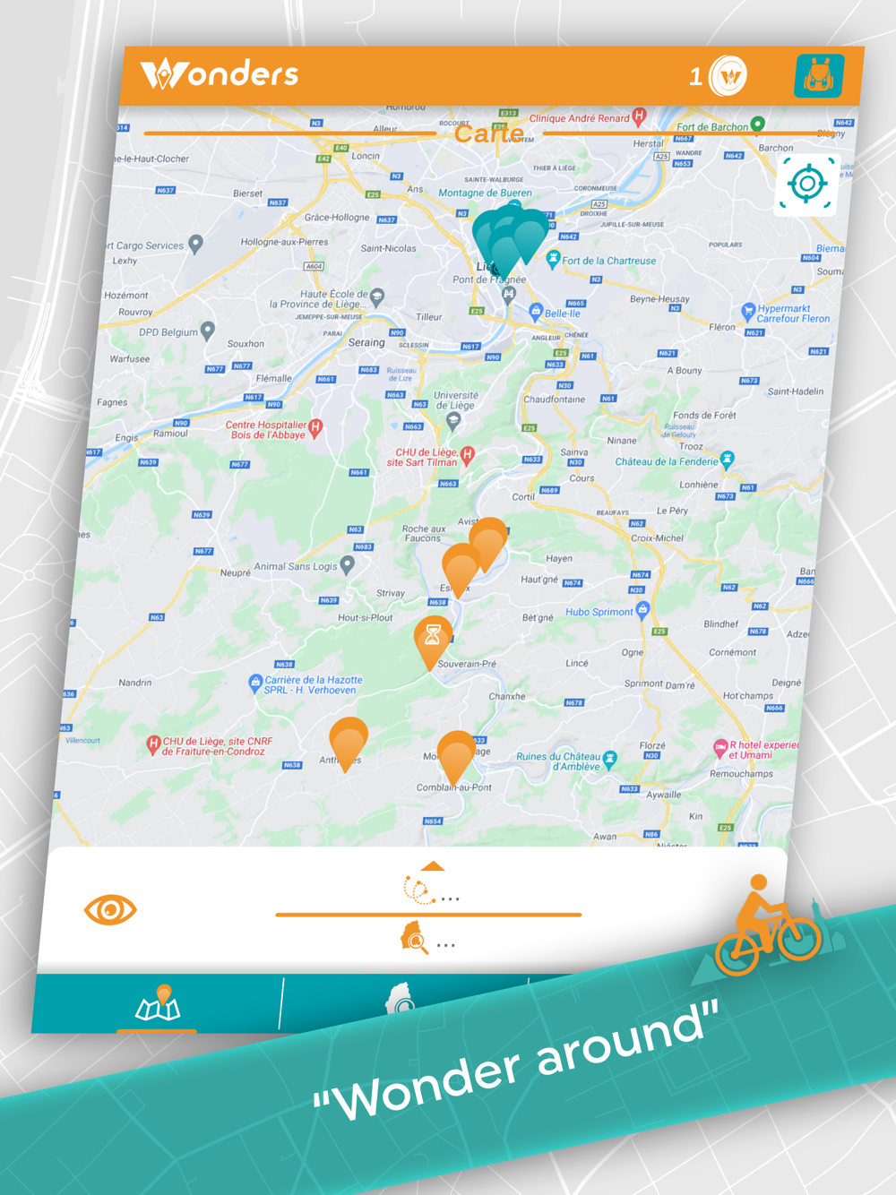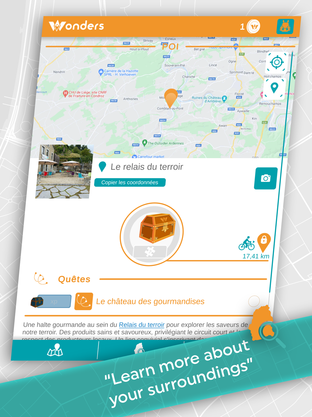 The Wonders application allows you to discover a territory through quests. Each territory contains a series of places to explore in order to collect a virtual treasure (symbolised by a "Wonder").
