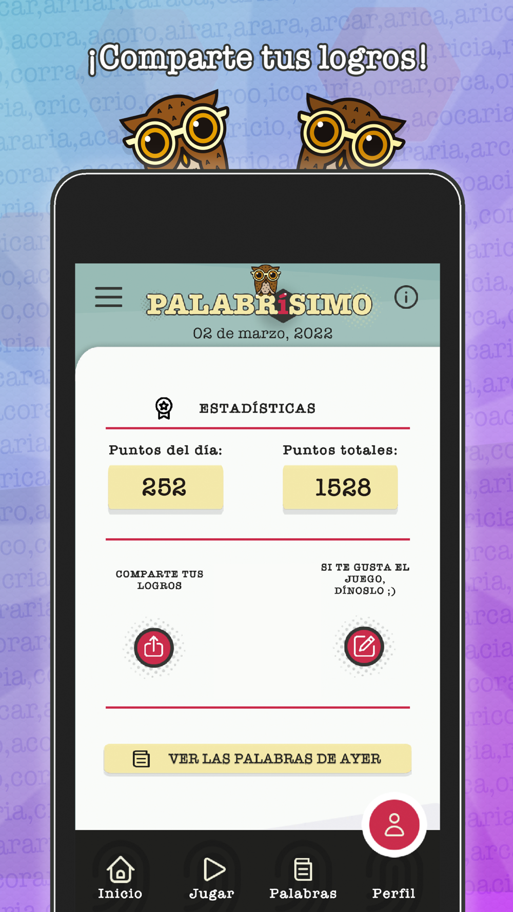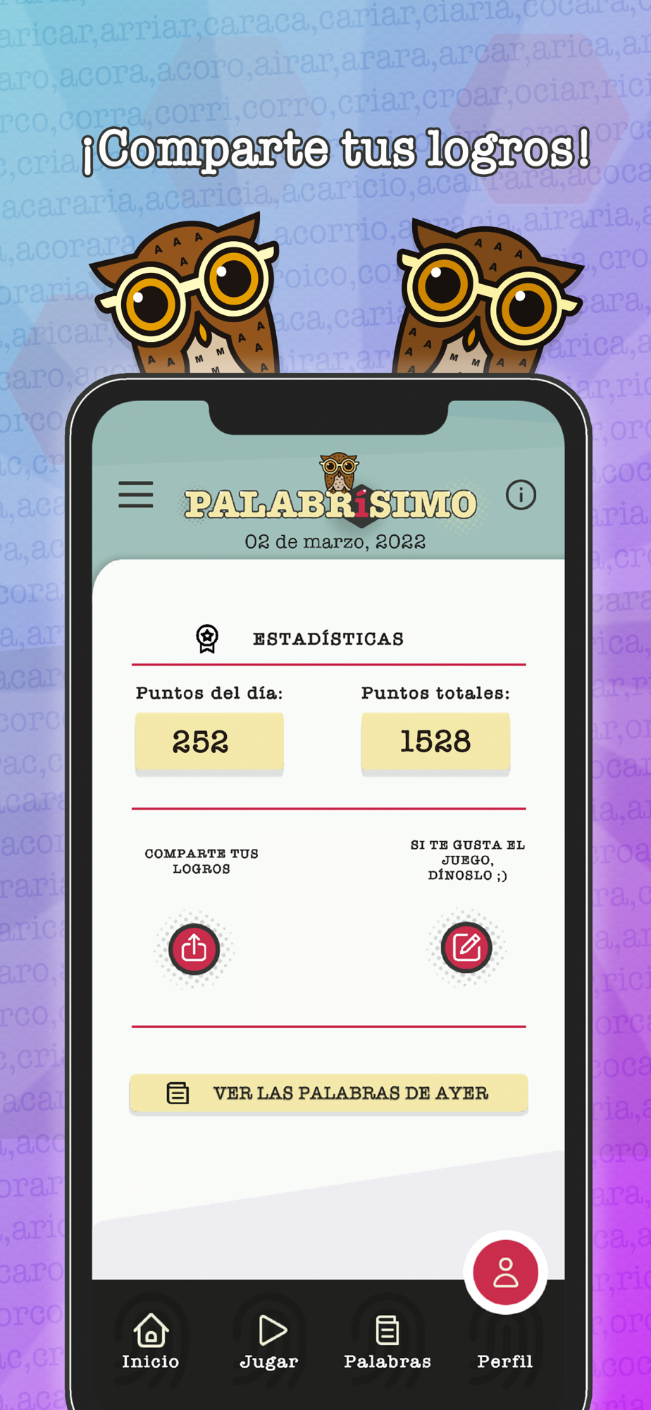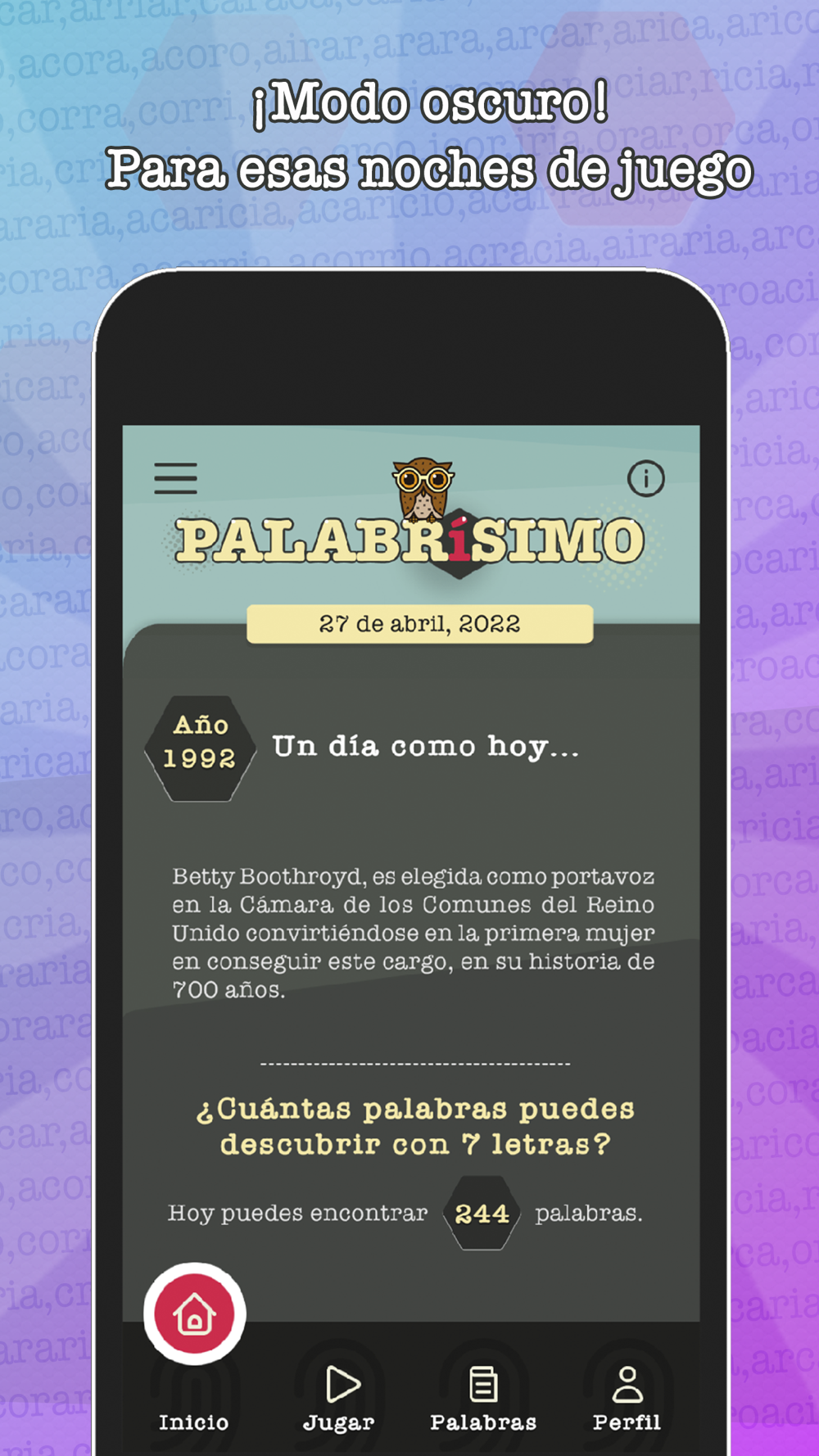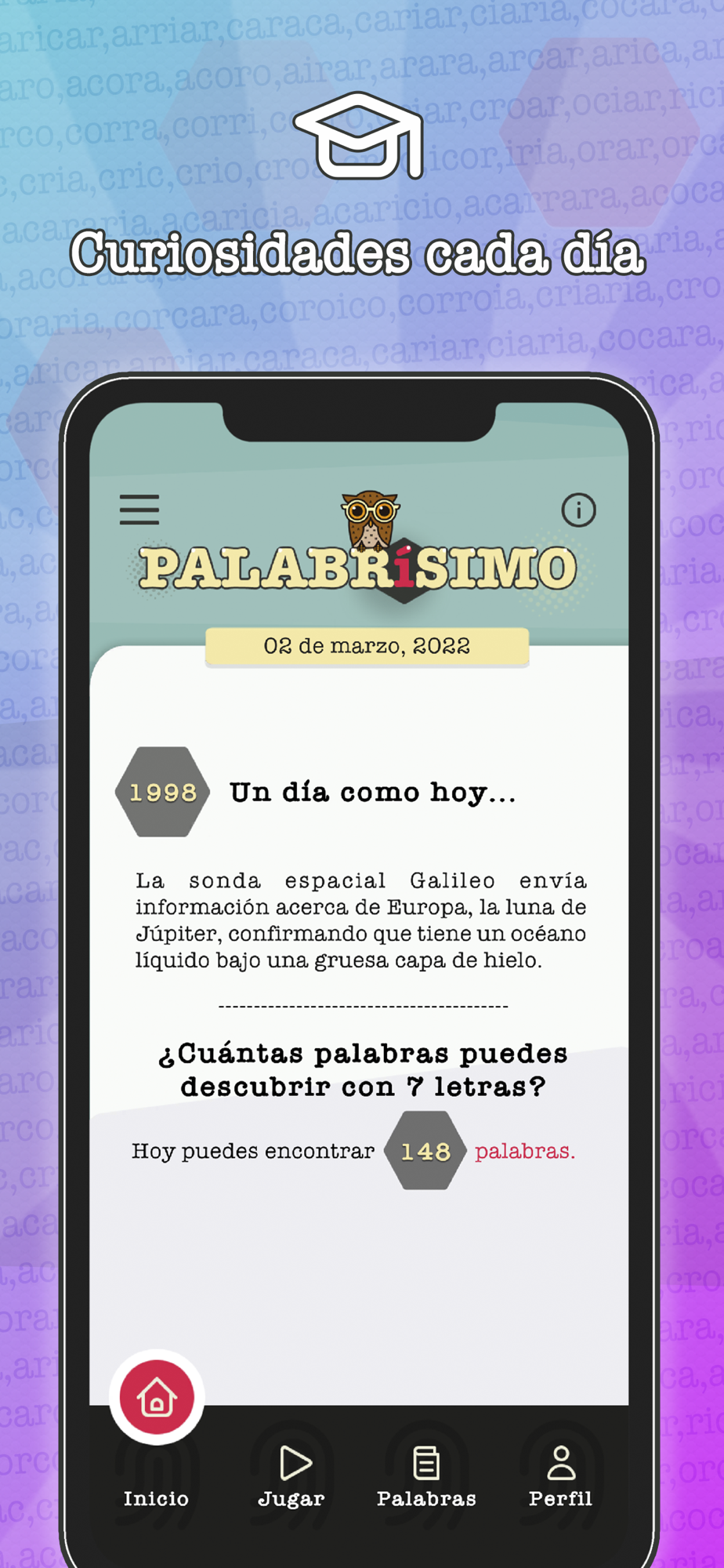 Nuestro equipo ha elaborado una cuidada base de datos de palabras en español para cada día del año, para que puedas divertirte y aprender mientras juegas. Además, puedes encontrar la ‘Palabra del día’, se trata de una palabra especial oculta que te otorga más puntuación y está relacionada con una pista que te daremos al iniciar el juego, podrás ver un hecho histórico, curioso o especial del día en el que estás jugando y así adivinar cual puede ser esa palabra además de conocer nuevos datos de acontecimientos relacionados a un día como hoy.