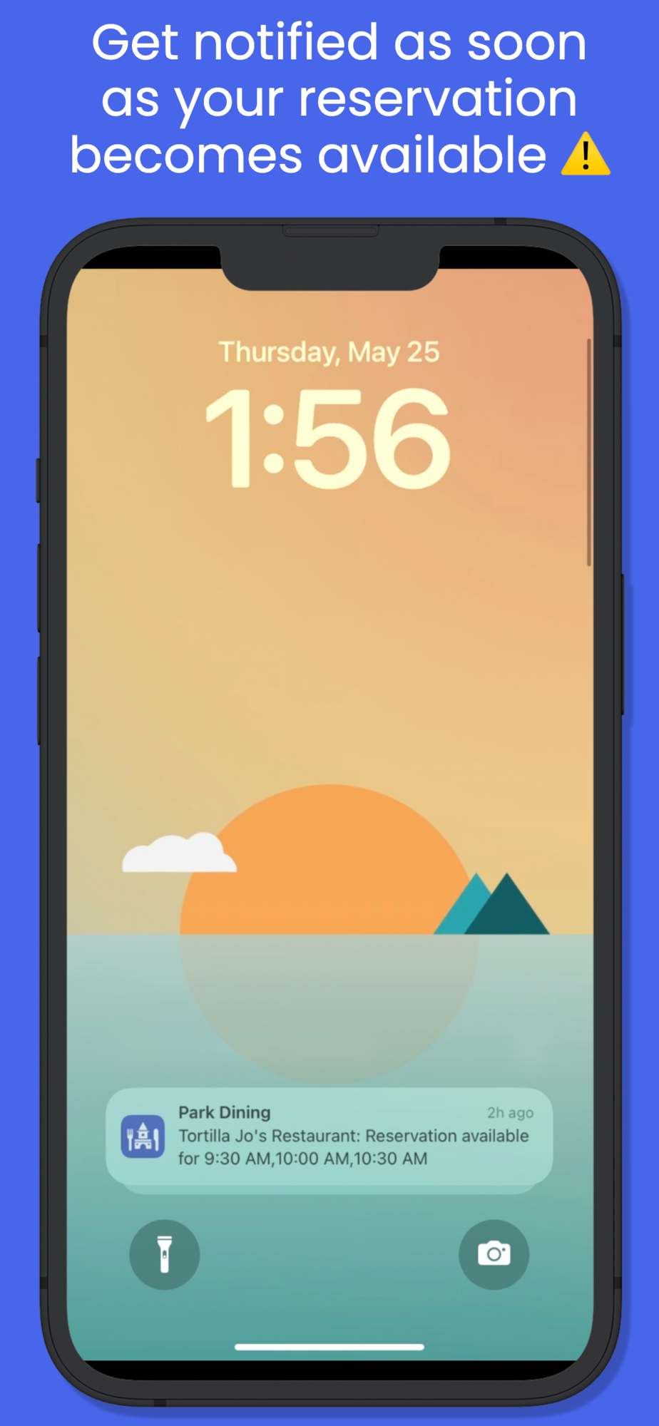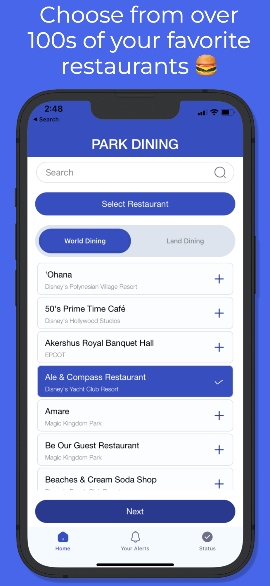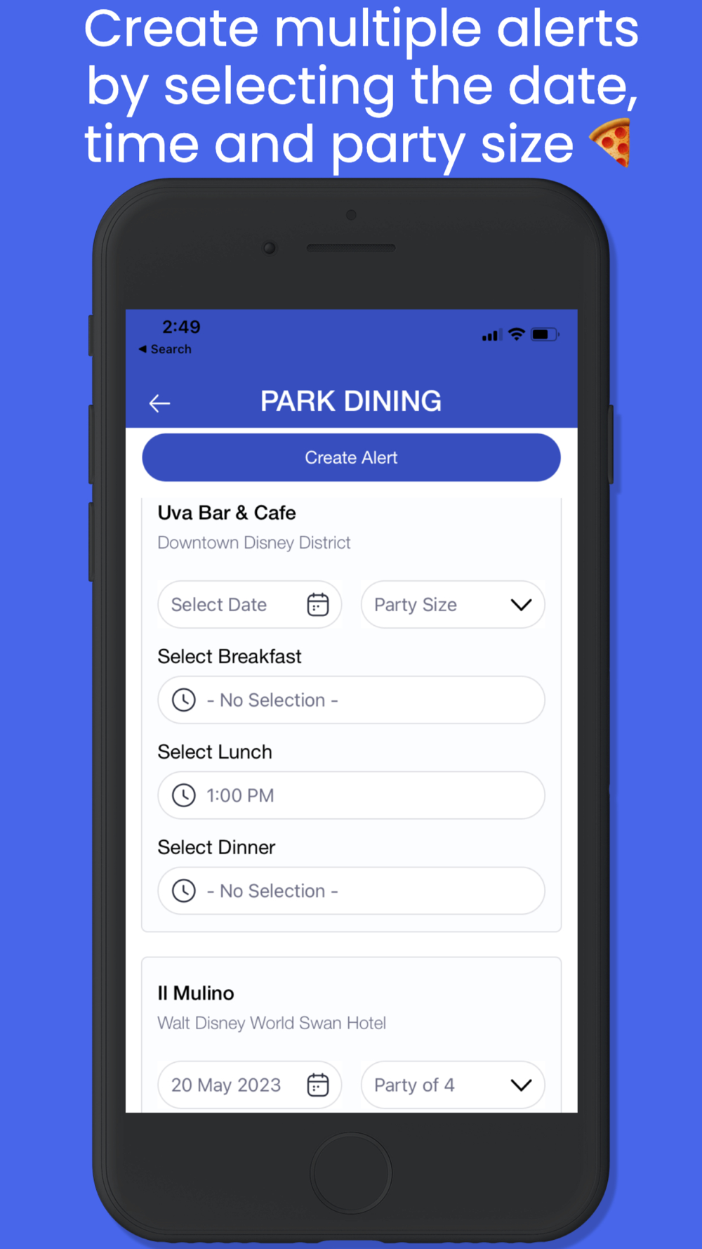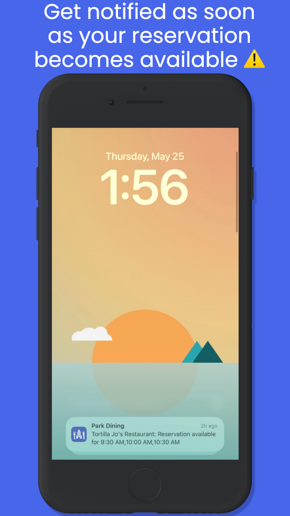 Simply create a dining alert by selecting the restaurant, the date, time and number of diners and sit back and wait to get notified when a reservation becomes available. You can book for multiple restaurants and times. Park Dining looks for openings based on your requests and immediately sends you a push notification when an opening becomes available.