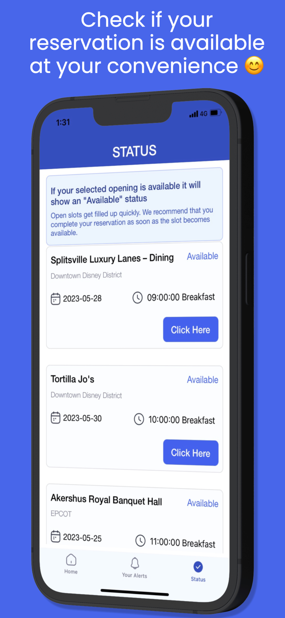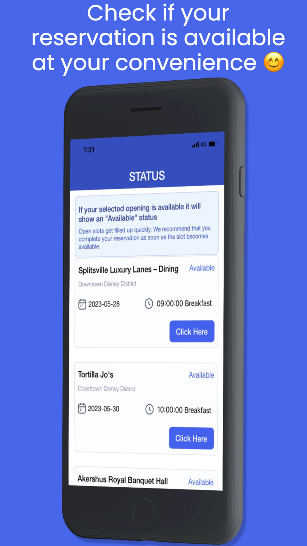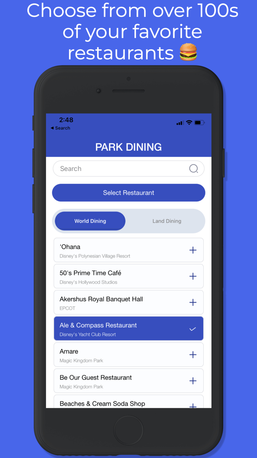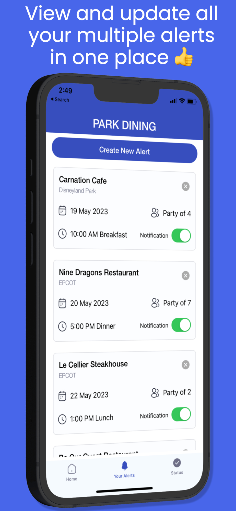 Simply create a dining alert by selecting the restaurant, the date, time and number of diners and sit back and wait to get notified when a reservation becomes available. You can book for multiple restaurants and times. Park Dining looks for openings based on your requests and immediately sends you a push notification when an opening becomes available.