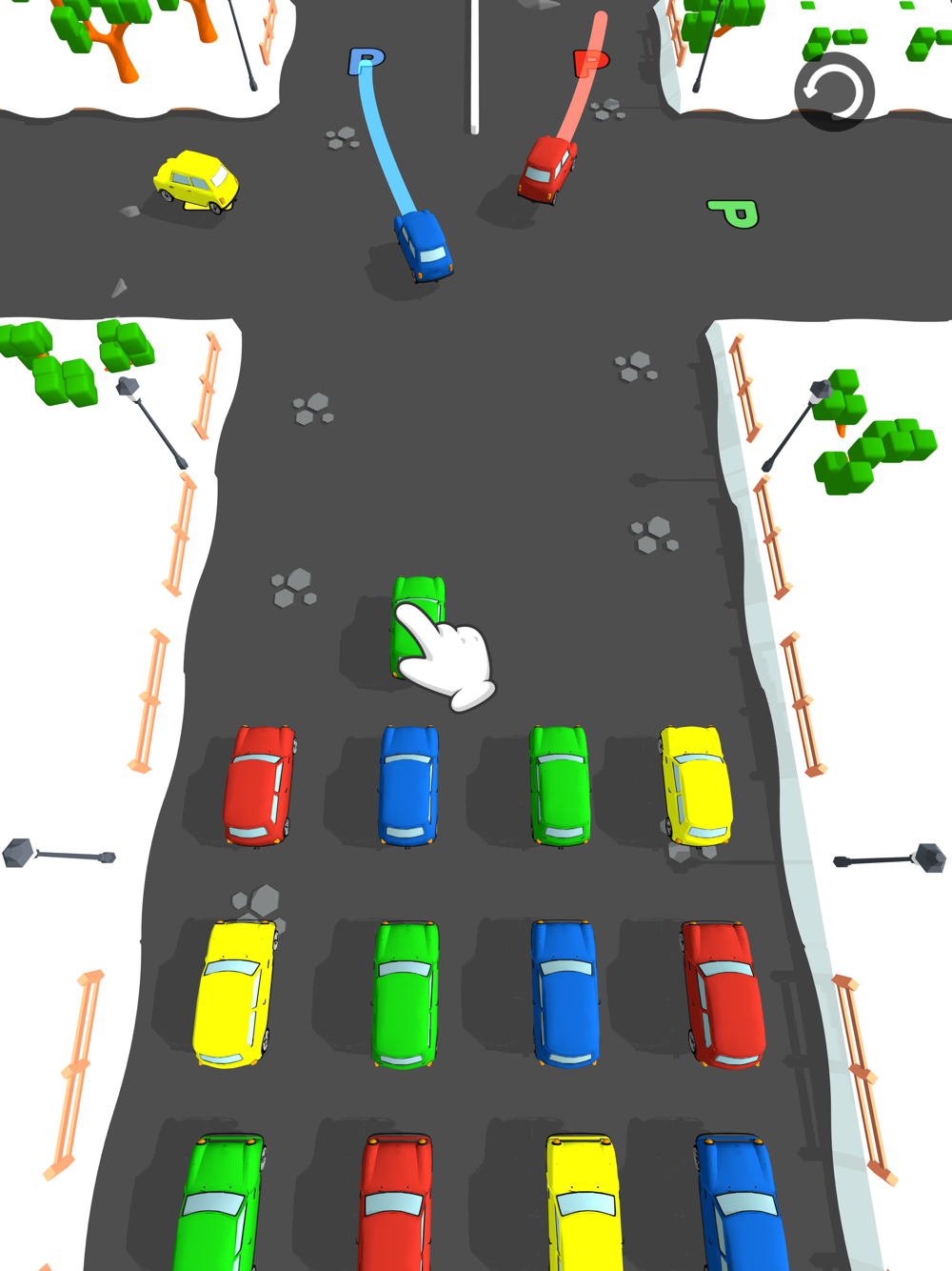 draw line with fingers moving around the car to parking, saving the car from obstacles, other cars, etc