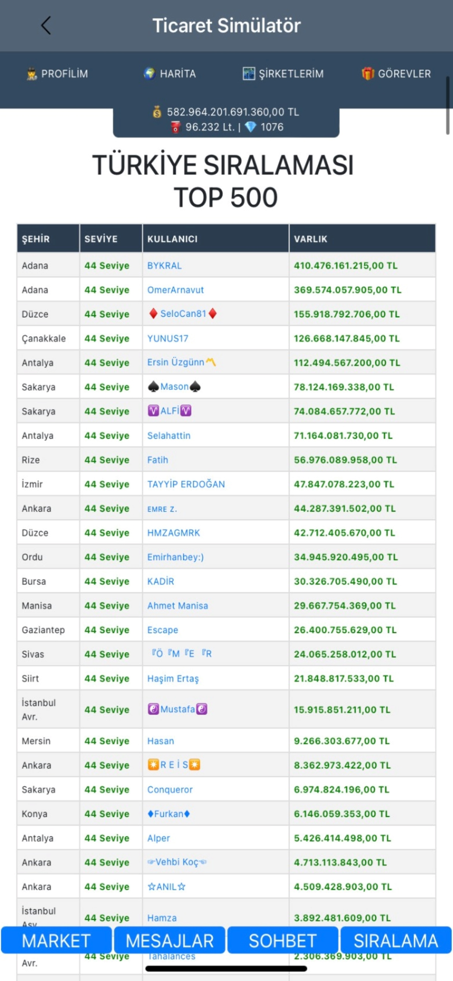 Ticaret simülasyon şirket kurma, şirket işletme ve araba alıp satma alt yapılı oyundur. En geniş ticaret ağı ile ile her türlü mesleği yaparak online olarak karşılıklı araç al sat yapabilirsiniz. Oteller açabilirsiniz. Anonim şirketleri kurarak ortak firmalar kurup yatırımlar yapabilirsiniz.