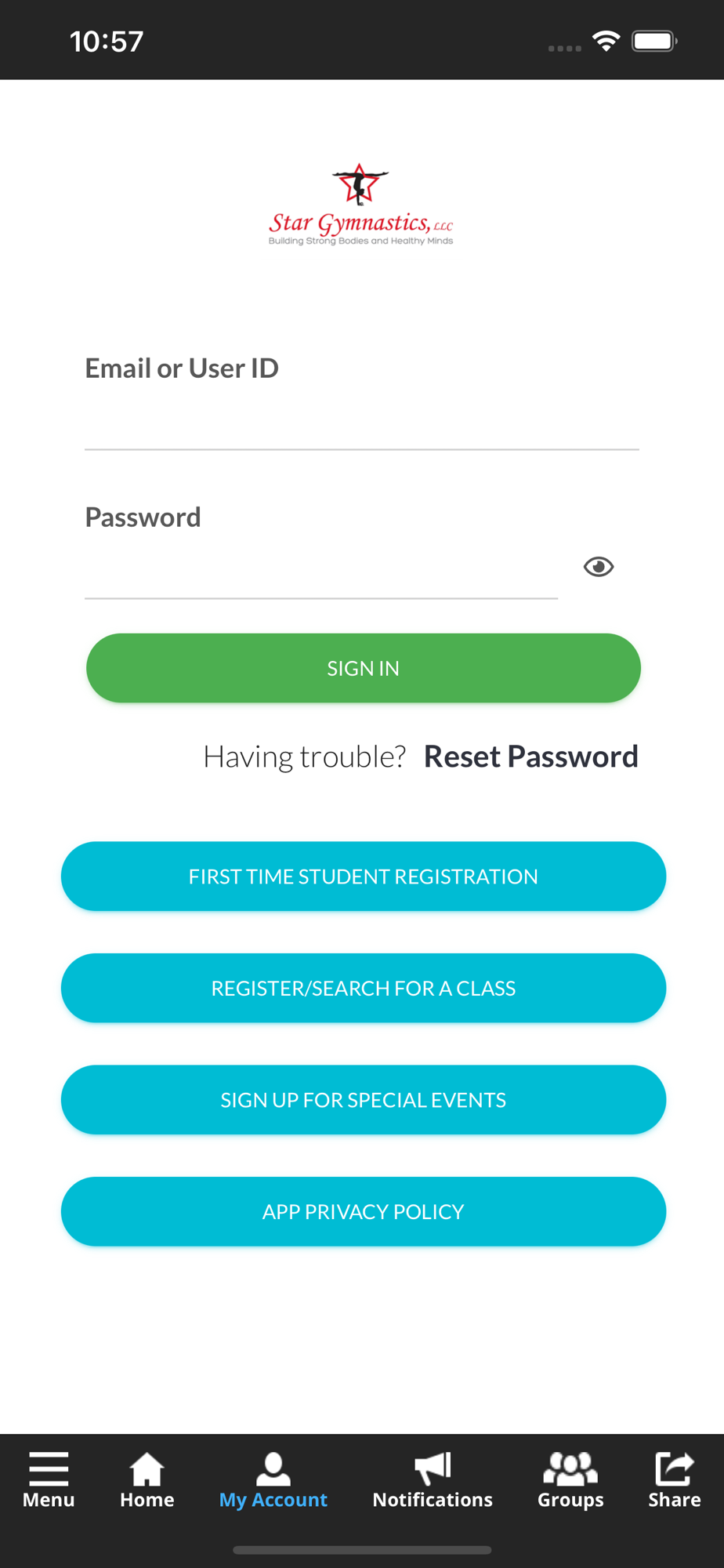 The Star Gymnastics app allows you to manage your account with ease, register for classes, parties, and special events. You'll also receive important notifications about class changes, closings, registration openings, special announcements, and upcoming events.