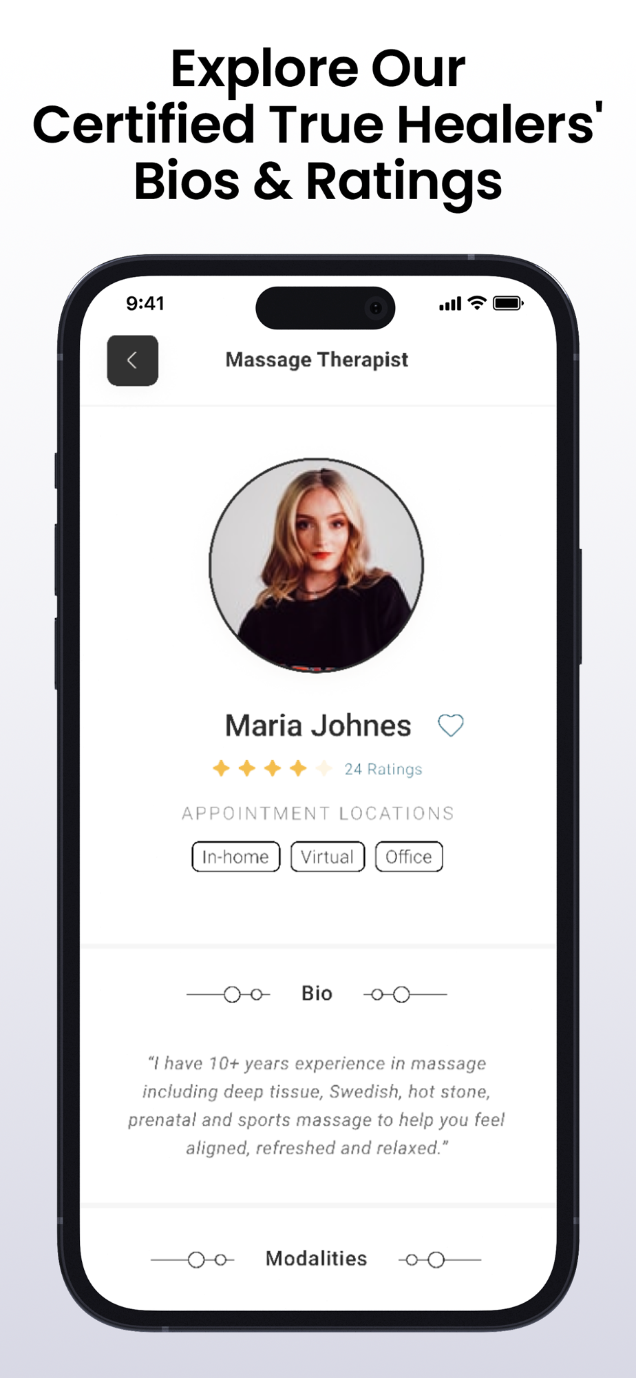 • Certified Healers: Explore the bios and ratings of certified True Healers to find the right practitioner for your needs. Schedule your appointment, and we’ll come to you. It’s that simple.