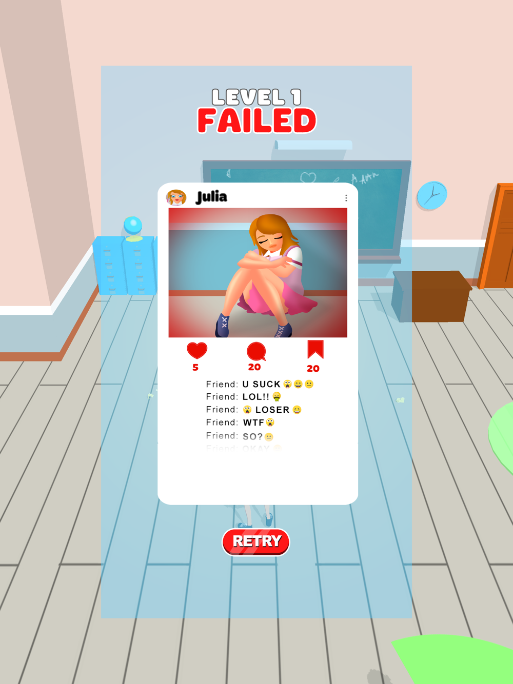 You are a lonely girl in highschool and those popular girls are hard to communicate with. Try to become one of them by gossiping and breaking the rules. But beware of the teacher, if you are caught you are expelled from the school. Sneak during class and gossip as much as you can! Your social media followers wait for you.