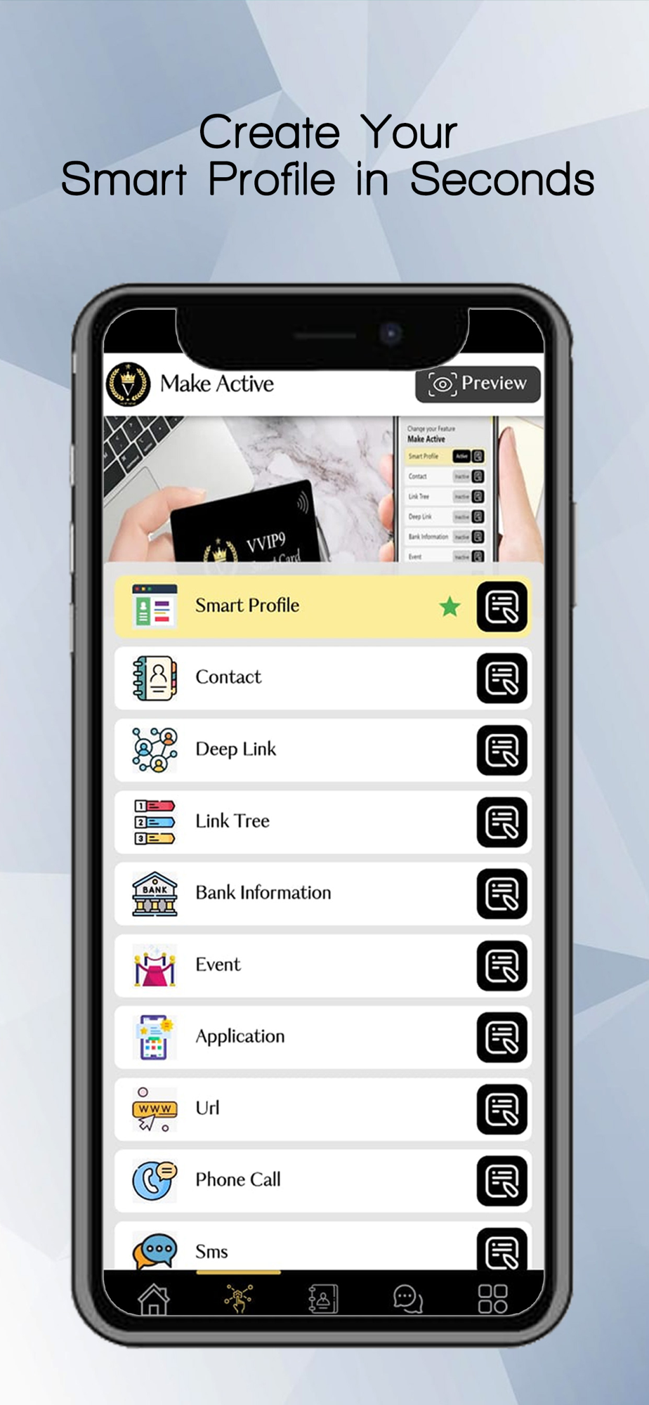Our smart products allow you to instantly share your contact info, social media, files, videos, more and especially Smart Profile with just a tap of your VVIP9 device or scan of your VVIP9 QR code. The best things, the other person doesn't need an app.