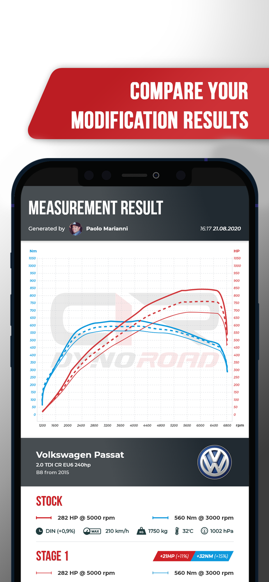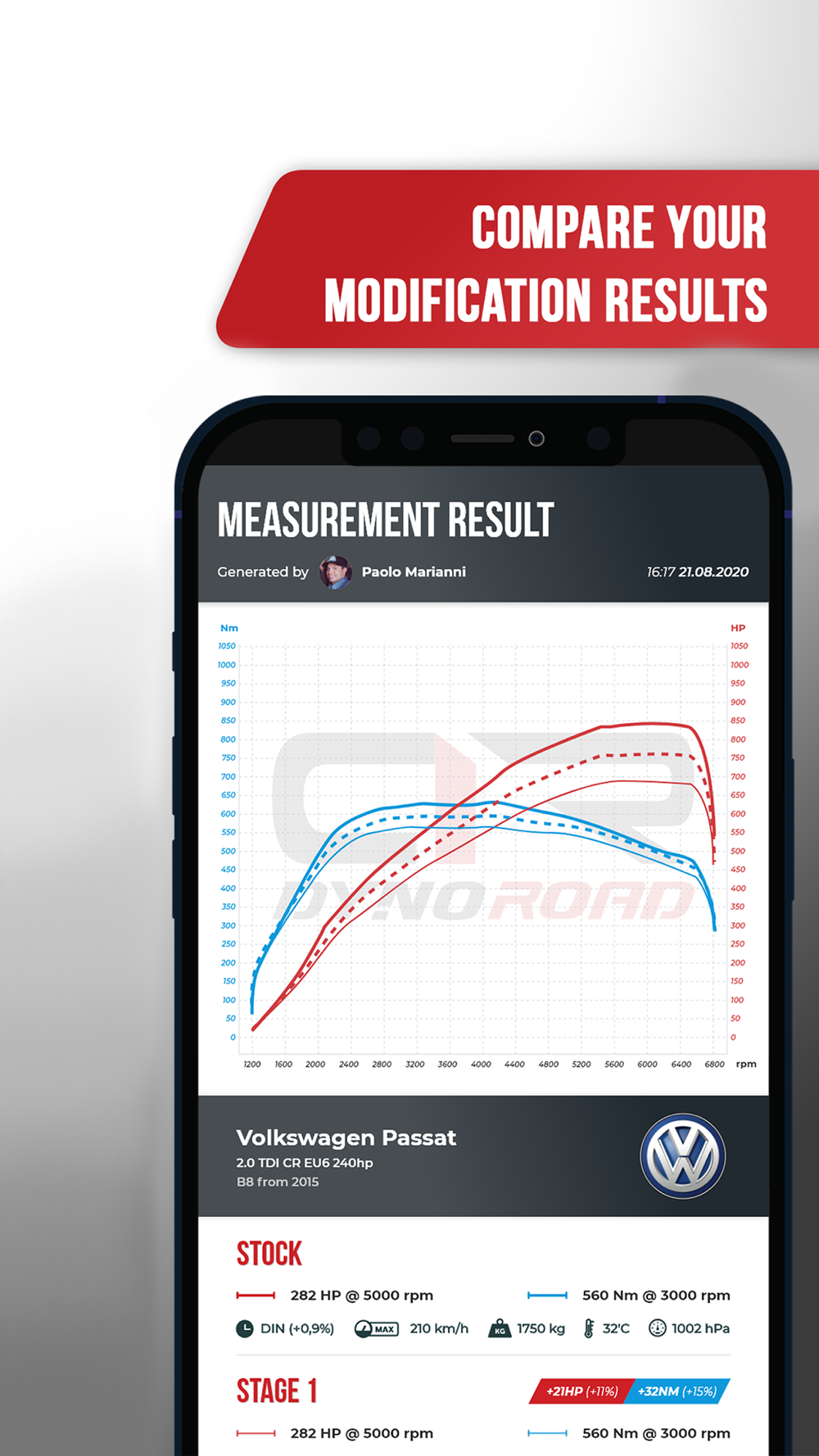 The DynoRoad connects to your smartphone via Bluetooth and shows you all the data you need so there's no need to attach extra cables to your vehicle, not even to the OBD Socket! All measurements are taken by our revolutionary probe!