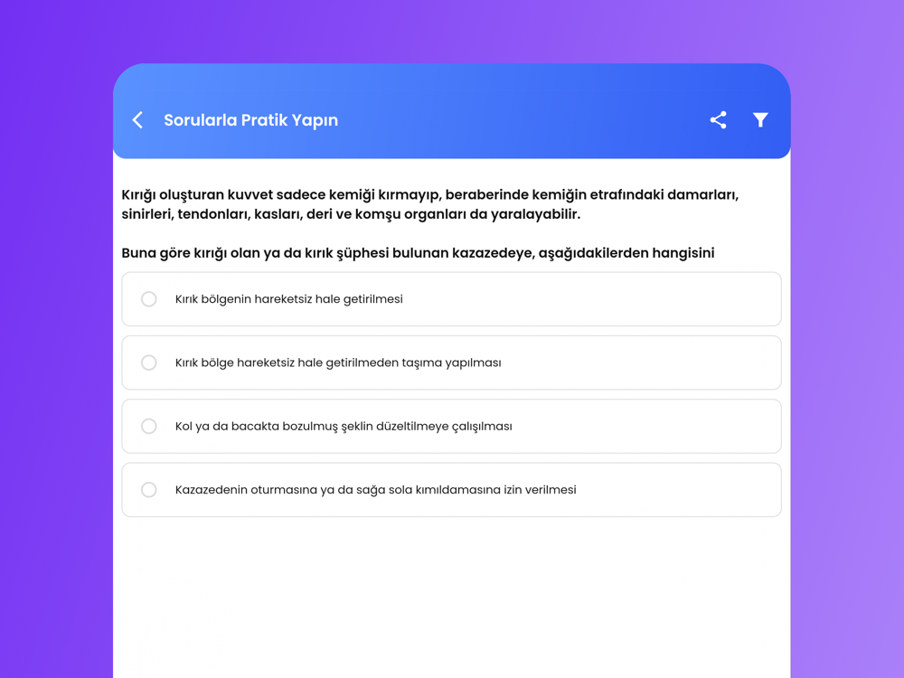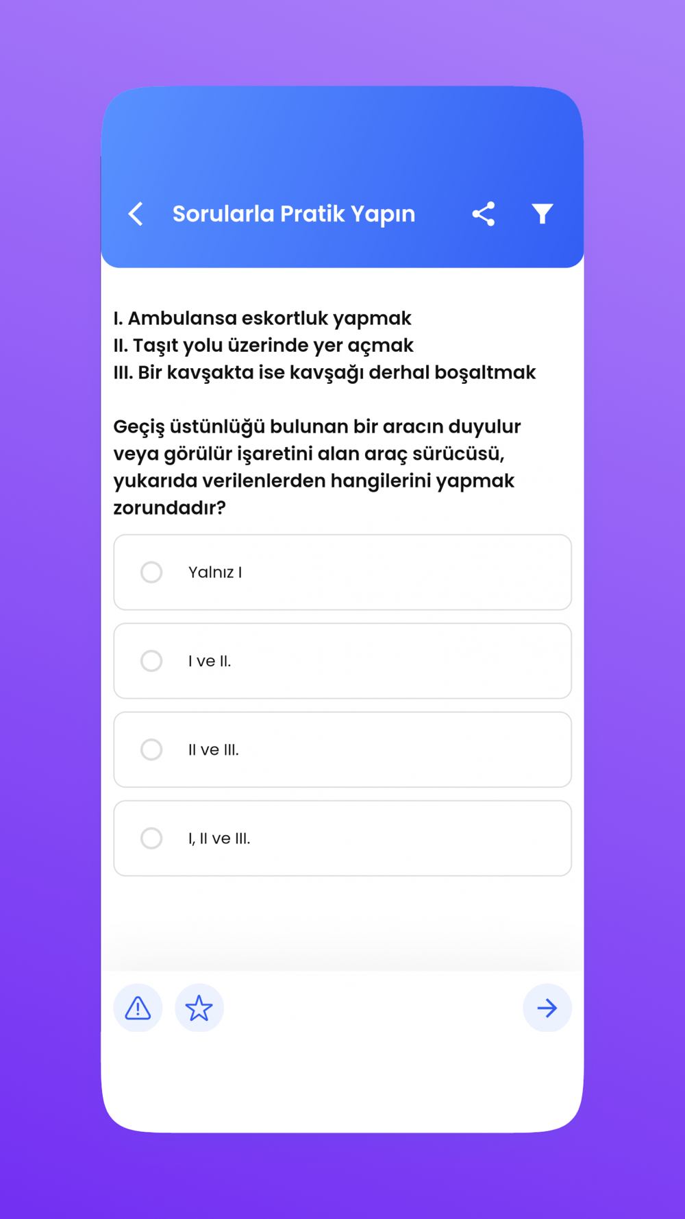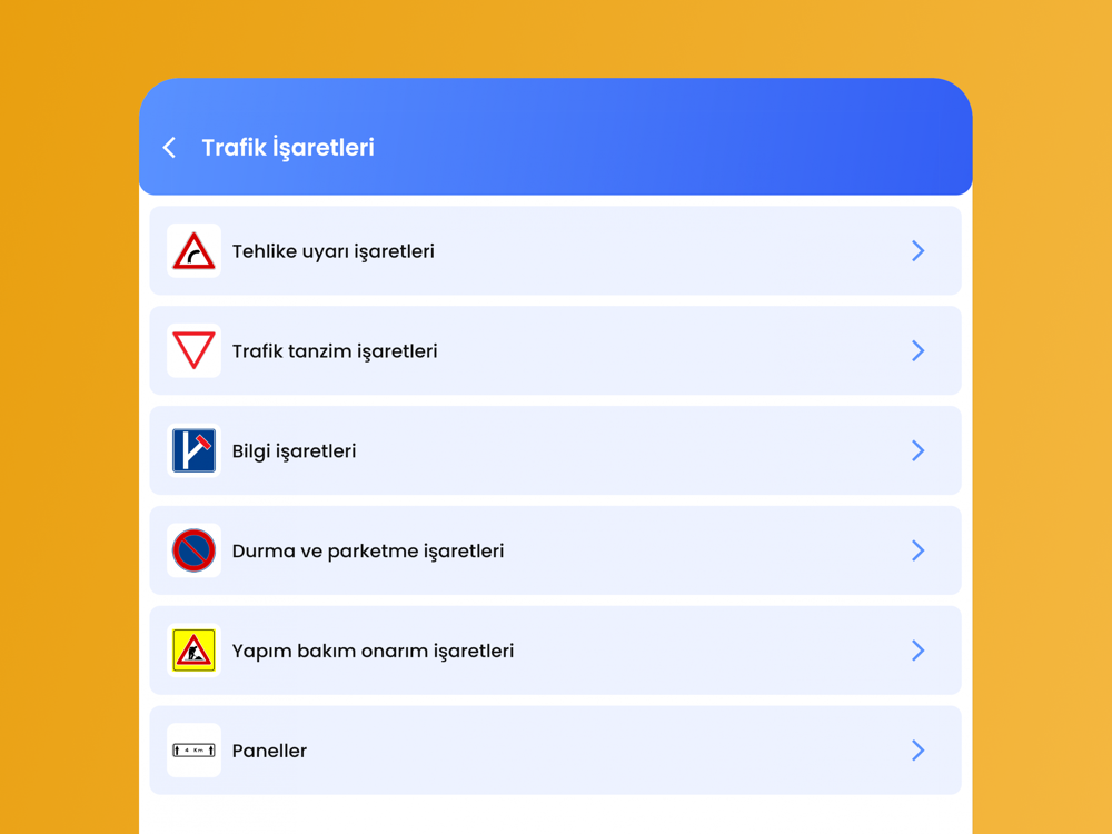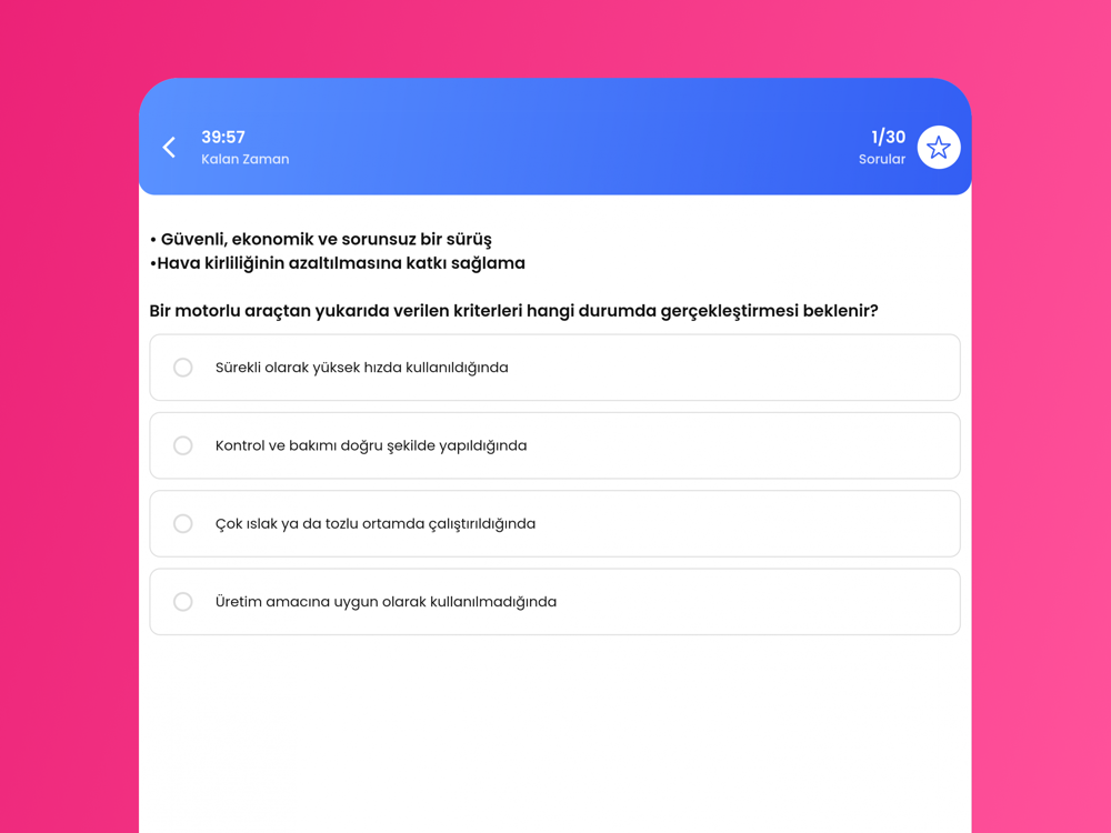 Sürücü Ehliyet Sınavına hazırlanmanın en iyi yolu pratik yapmaktır. Bu yüzden en iyilerle pratik yapın! Türkiye ehliyet sınavları için en kapsamlı veritabanını, hazırlık seviyenizi değerlendirmenize yardımcı olacak bir test simülasyonu modunu ve hatta en eksiksiz sürücü eğitimi deneyimi için çevrimiçi bir video kursunu sunuyoruz.