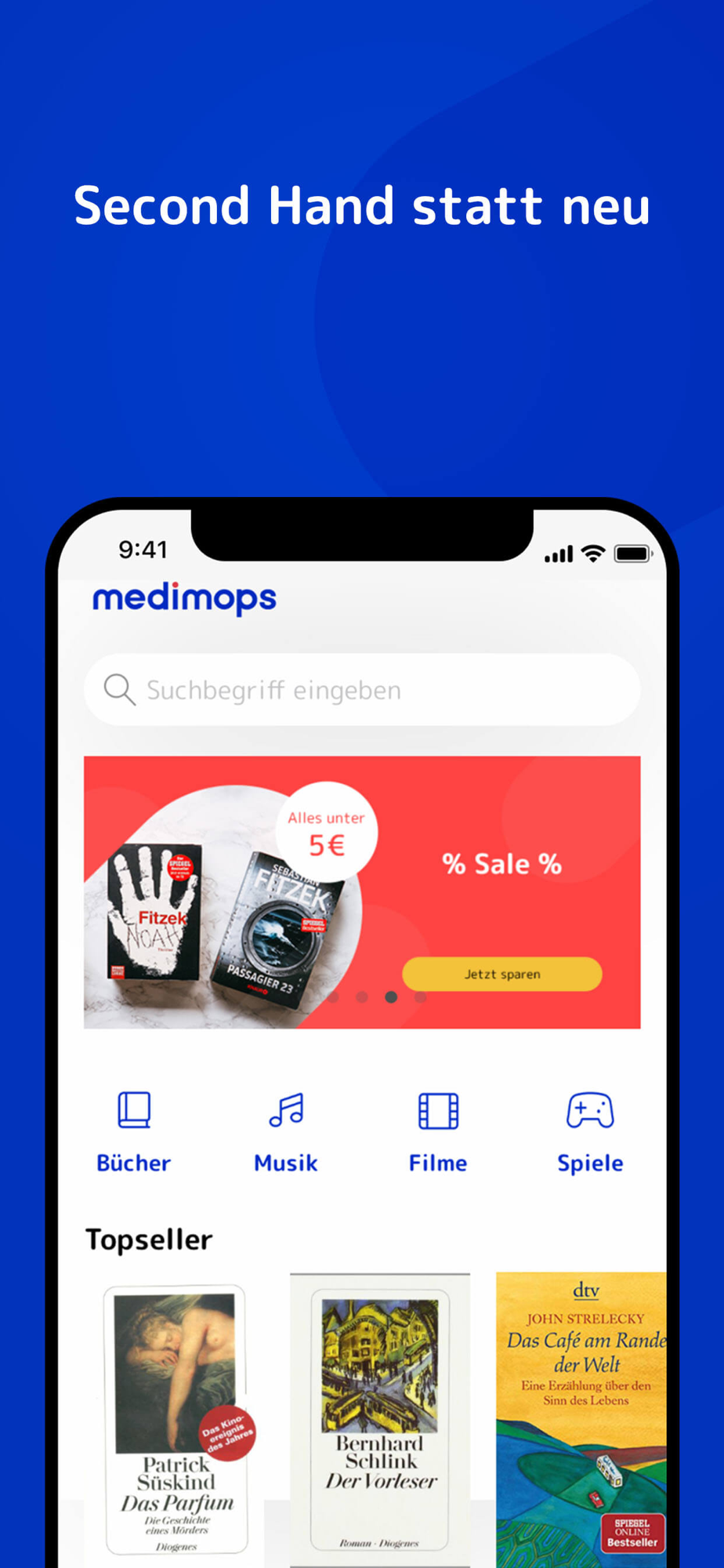 medimops ist deine kostenlose App für gebrauchte Bücher, Musik, Games und Filme. Unser Second Hand Onlineshop bietet dir eine große Auswahl an gebrauchten und neuen Artikeln zu günstigen Preisen: Mehr als 4 Millionen Bücherschnäppchen und andere Medien warten auf ein neues Zuhause. Spare mit der medimops App bis zu 70% gegenüber dem Neupreis - jetzt auch ganz einfach unterwegs mit deinem Smartphone.