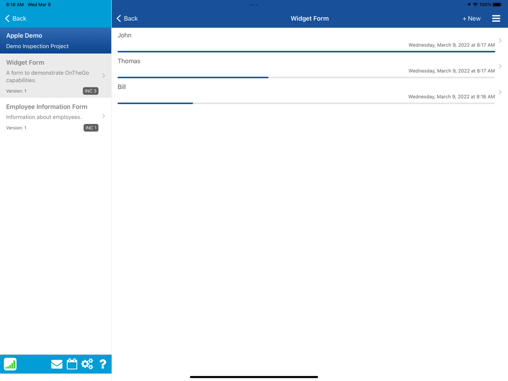 OnTheGo was designed to 'Always Work', whether the user is in town or in the remotest fields, the forms on the device will be available. Using a quick syncing system large data sets can be quickly loaded on the device when in network connections and stored for offline use. Credit card and Check payments can be performed online or offline with the companion application OTG Pay.