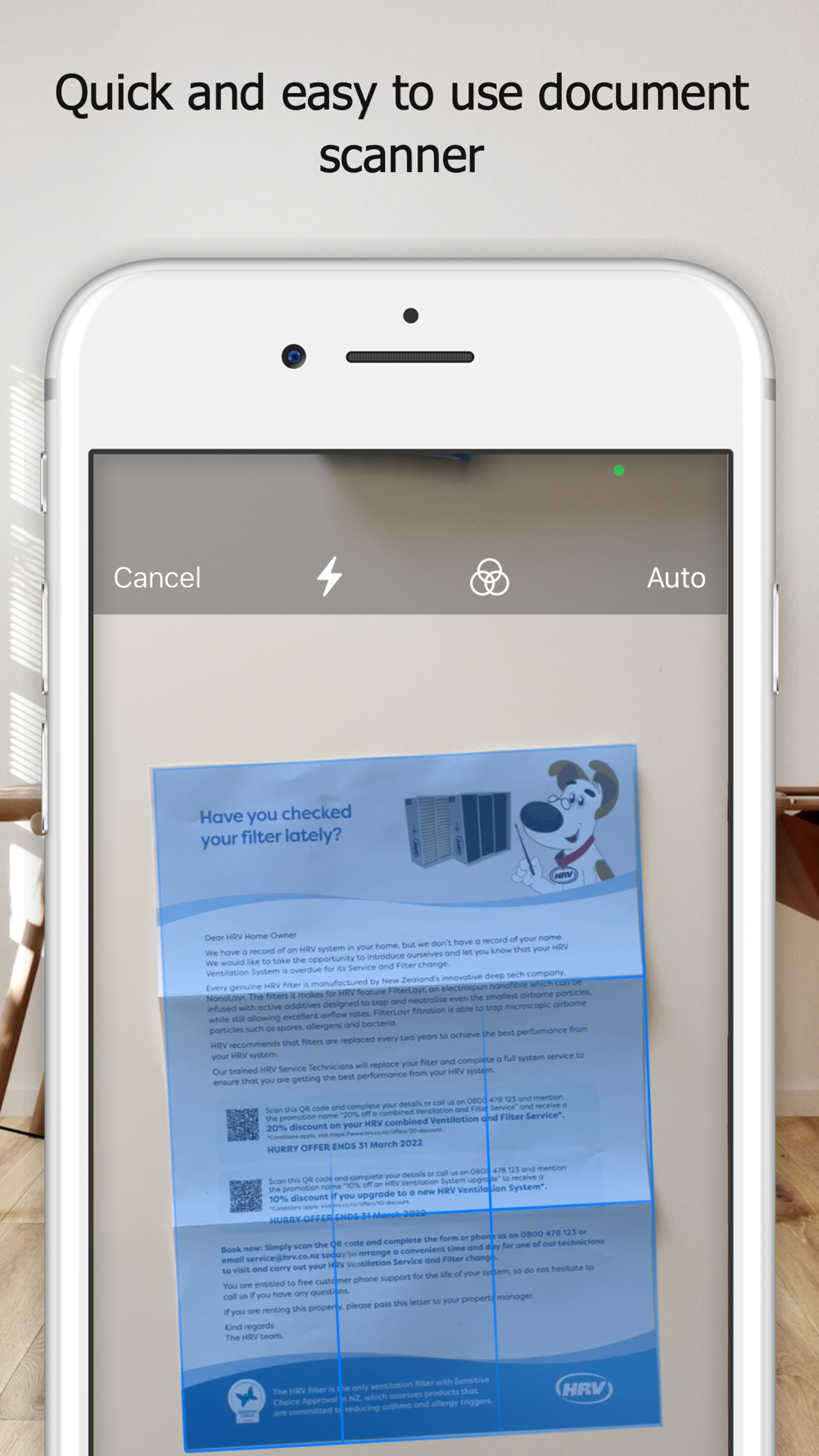 ScanPad is a quick and easy to use document scanner. Simply set your document on the table, frame it up on the screen, and take a picture. That's it! The document will be converted to a PDF file and stored locally on your device.