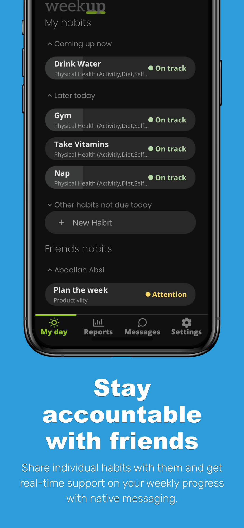 Share individual habits and your personal development score with friends or your significant other. Instantly message them on the app to motivate them or offer them new ideas to try for the next week.