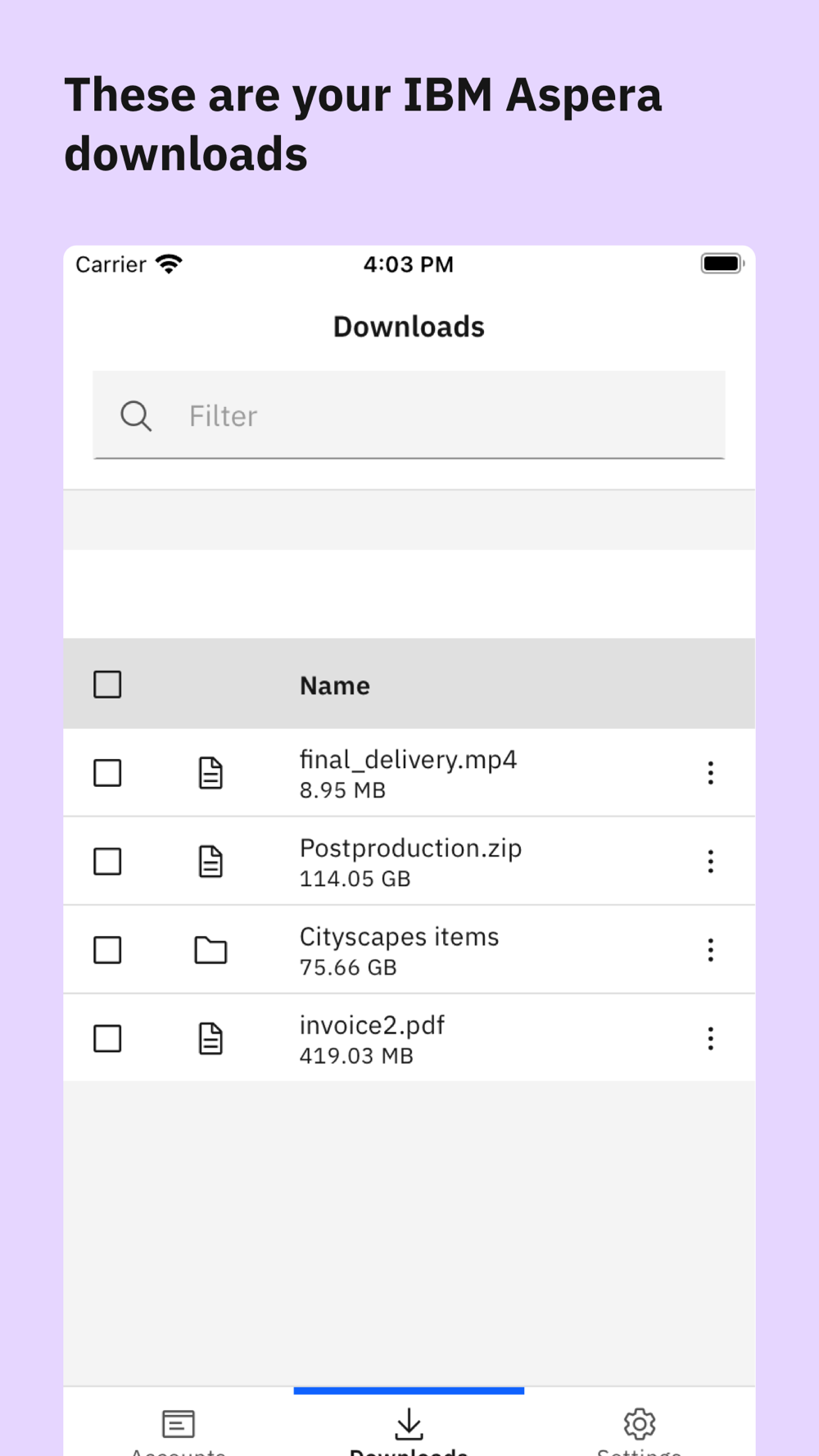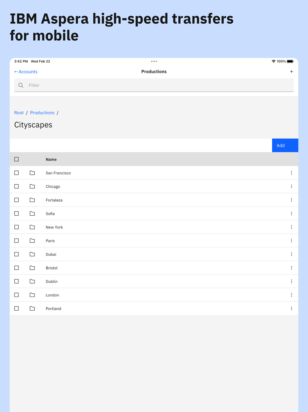Enjoy streamlined functionality for fast FASP file transfers to and from your IBM Aspera server by linking to your server account in the mobile app.