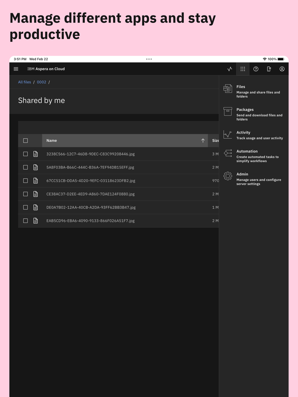 • Simply link your IBM Aspera server account on the app to upload, download, and share files from anywhere.