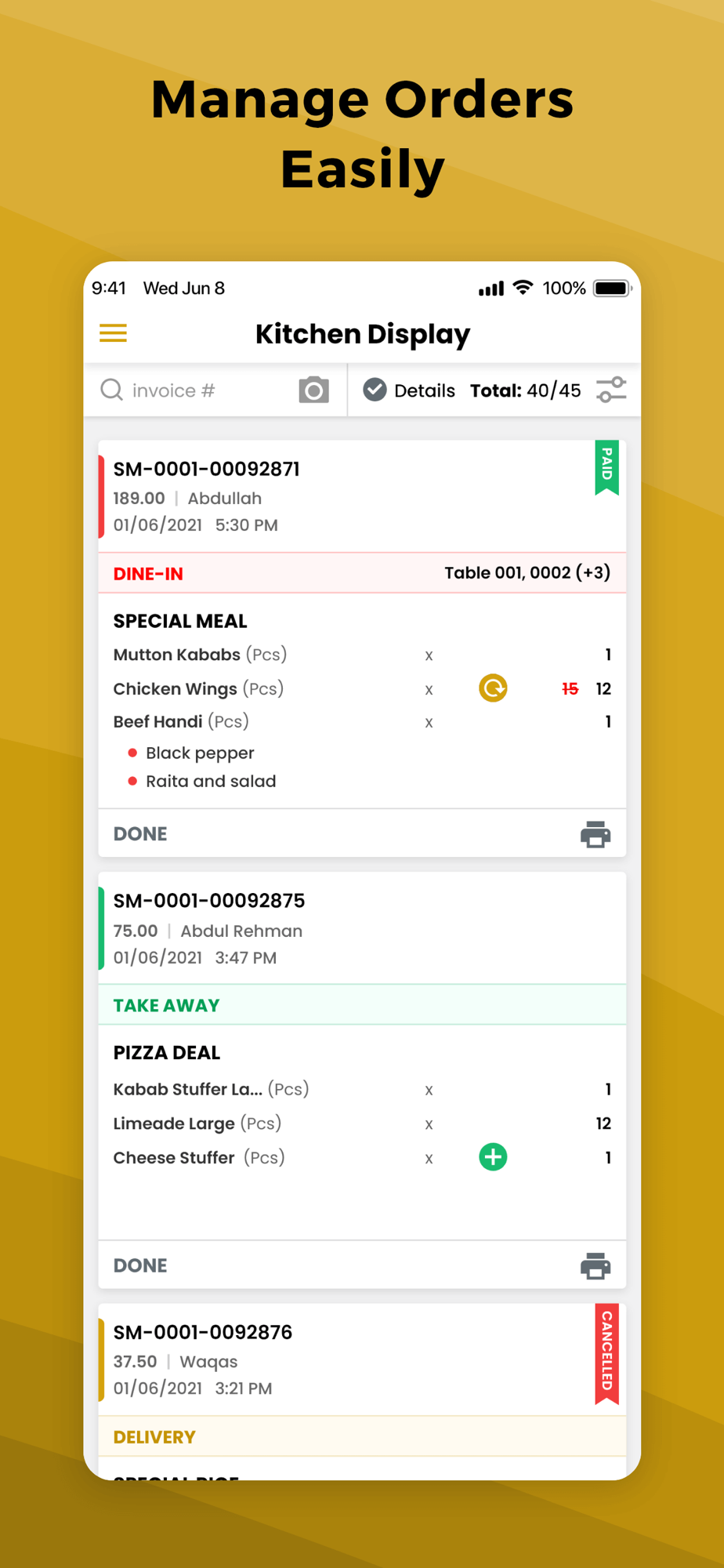 • You can create different users for your salespersons. The app prints salesperson’s name with each order to refer to if required.