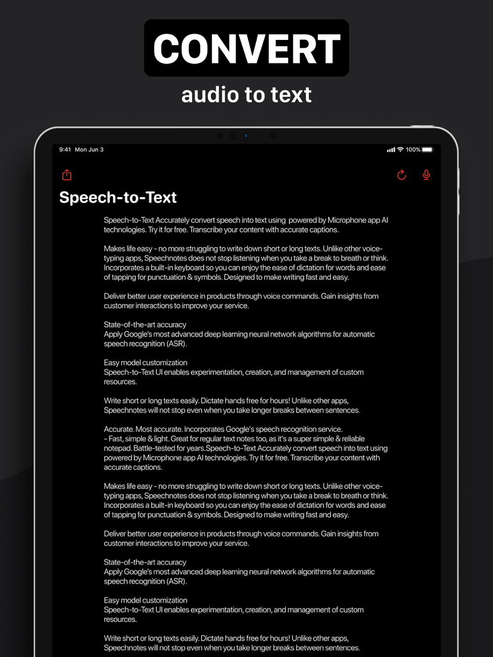 Speech-to-Text Accurately convert speech into text using powered by Microphone app AI technologies. Transcribe your content with accurate captions.