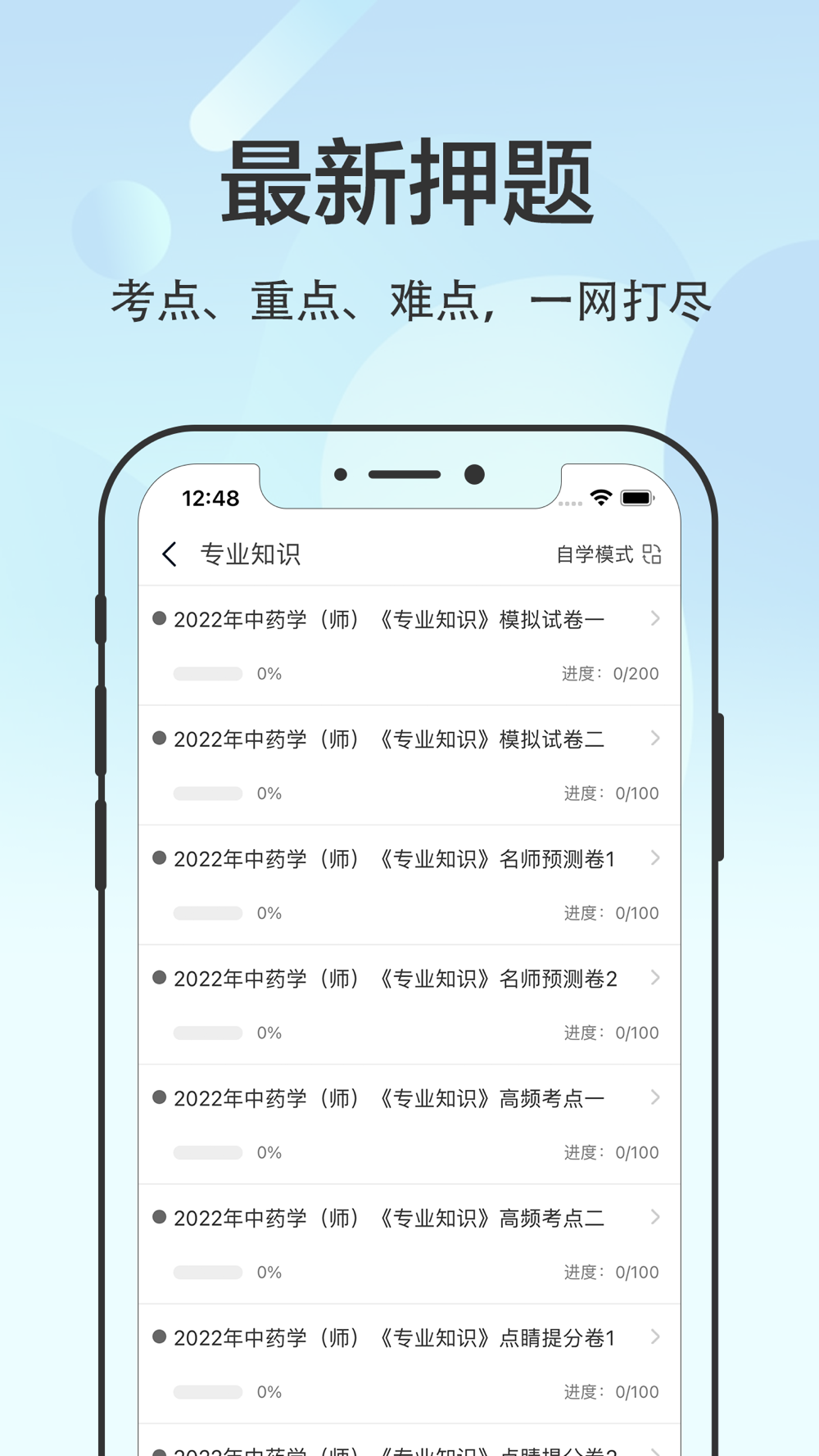 初级中药师考试题库2022分为不同题型,试题含:基础知识、相关专业知识、专业知识、专业实践能力,A1、B1型题,试题解析,随时随地刷题,初级中药师考试过关必备神器。