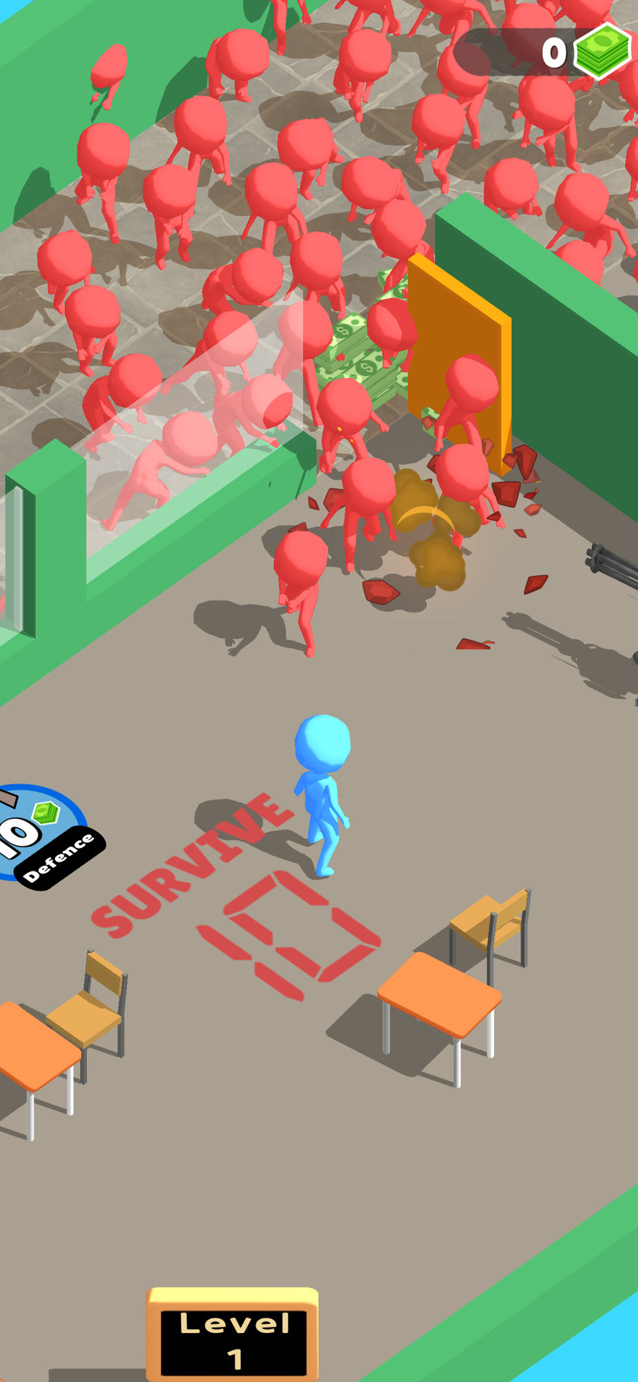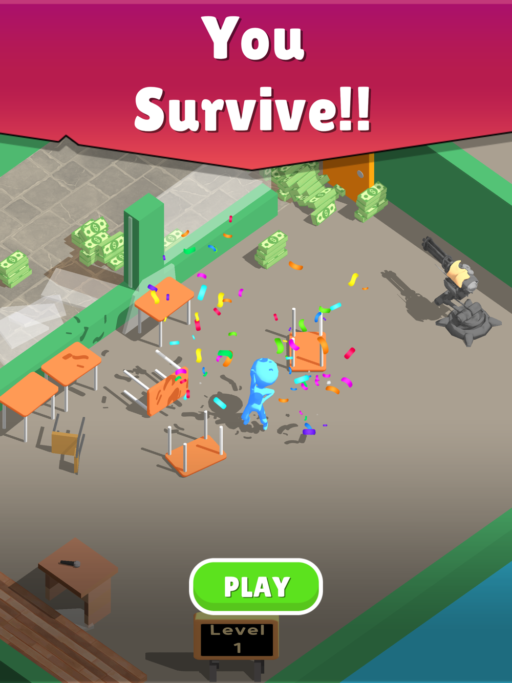 Use your resource to add weapon and defense facilities. Try to survive until dawn. You are the only survivor on campus.