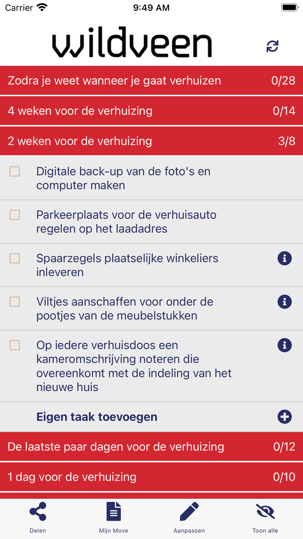Met onze verhuisapp weet je namelijk tijdens alle fases van je verhuizing wat je moet doen en kun je zelf ook taken toevoegen, naast de handige taken en aandachtspunten die de app al voor je aangemaakt heeft, waaronder: