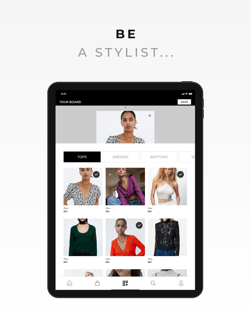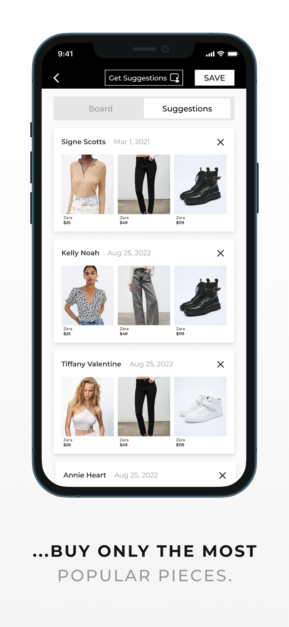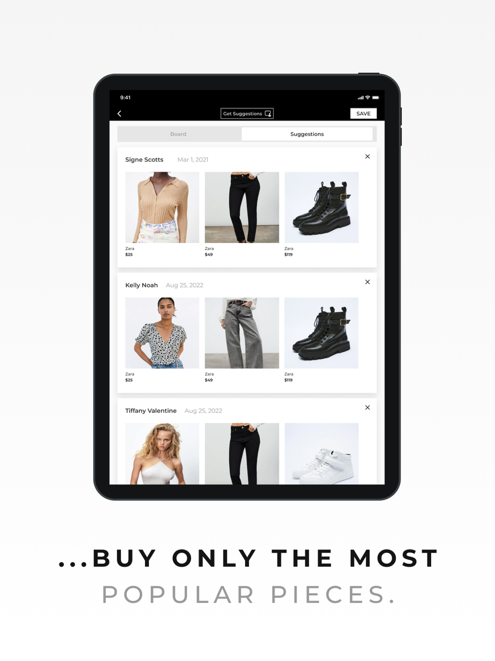Our integrated board tools allow you to easily add, remove, save and share outfits without leaving the app.