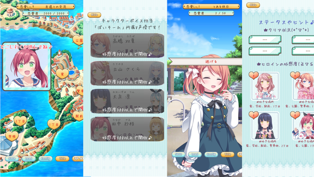 クリア状況や各ヒロインの好感度、ヒロインが現れる場所など、ヒント情報を見ることが出来ます。