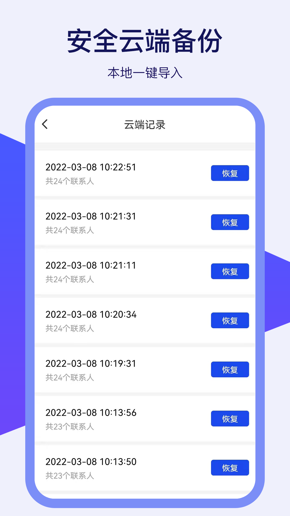 【智能同步】:一键同步通讯录,帮你搬运所有联系人信息。云端备份,本地导入,还原信息只需要点击按钮,即刻完成!