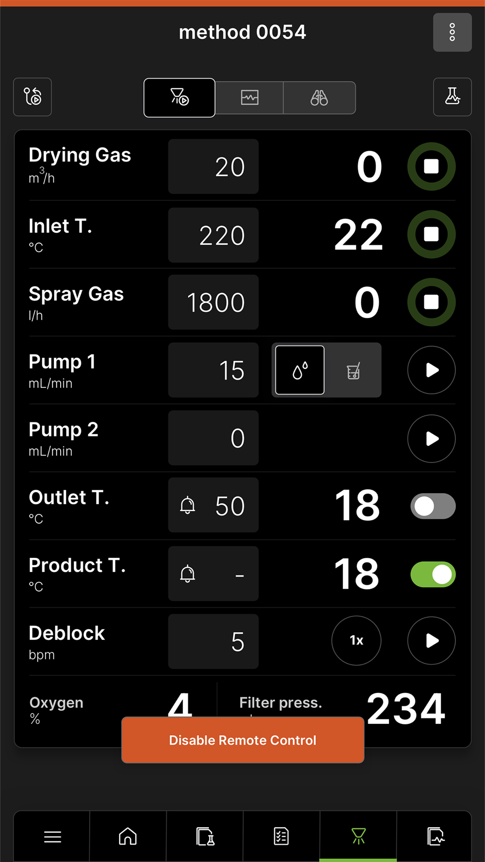 - Live view of set and current parameters, including temperatures, flow of spray gas, drying gas and pump speed