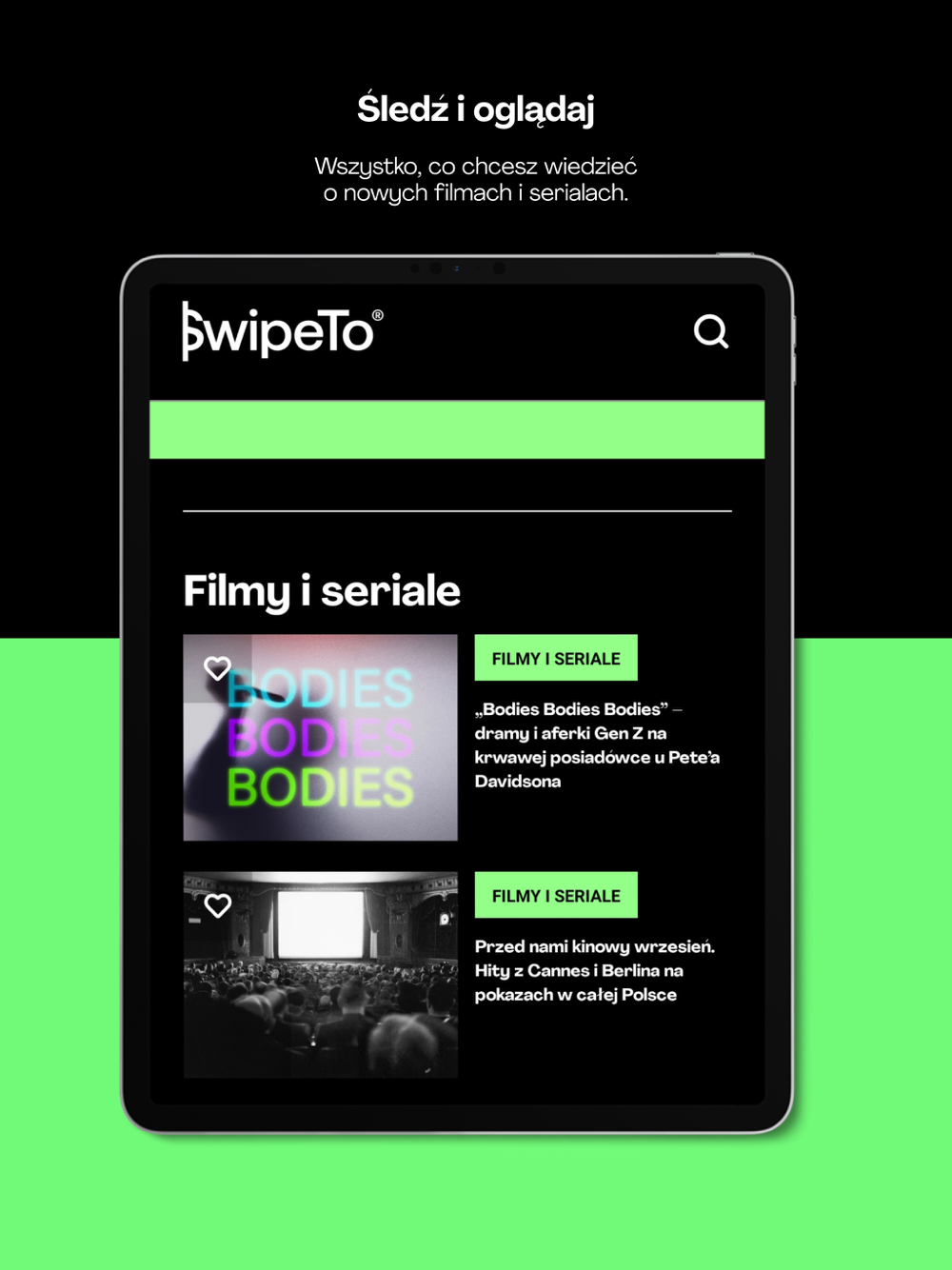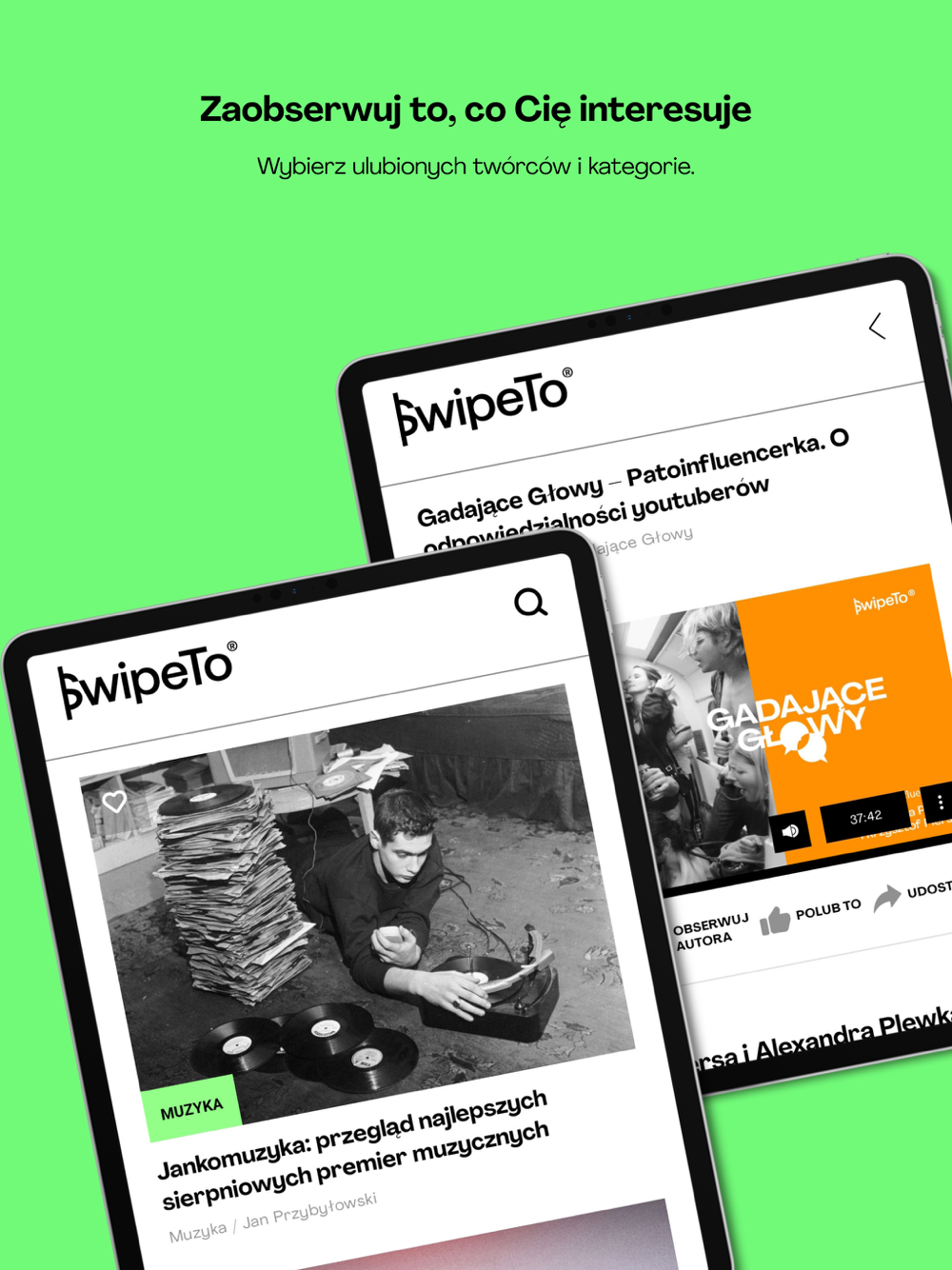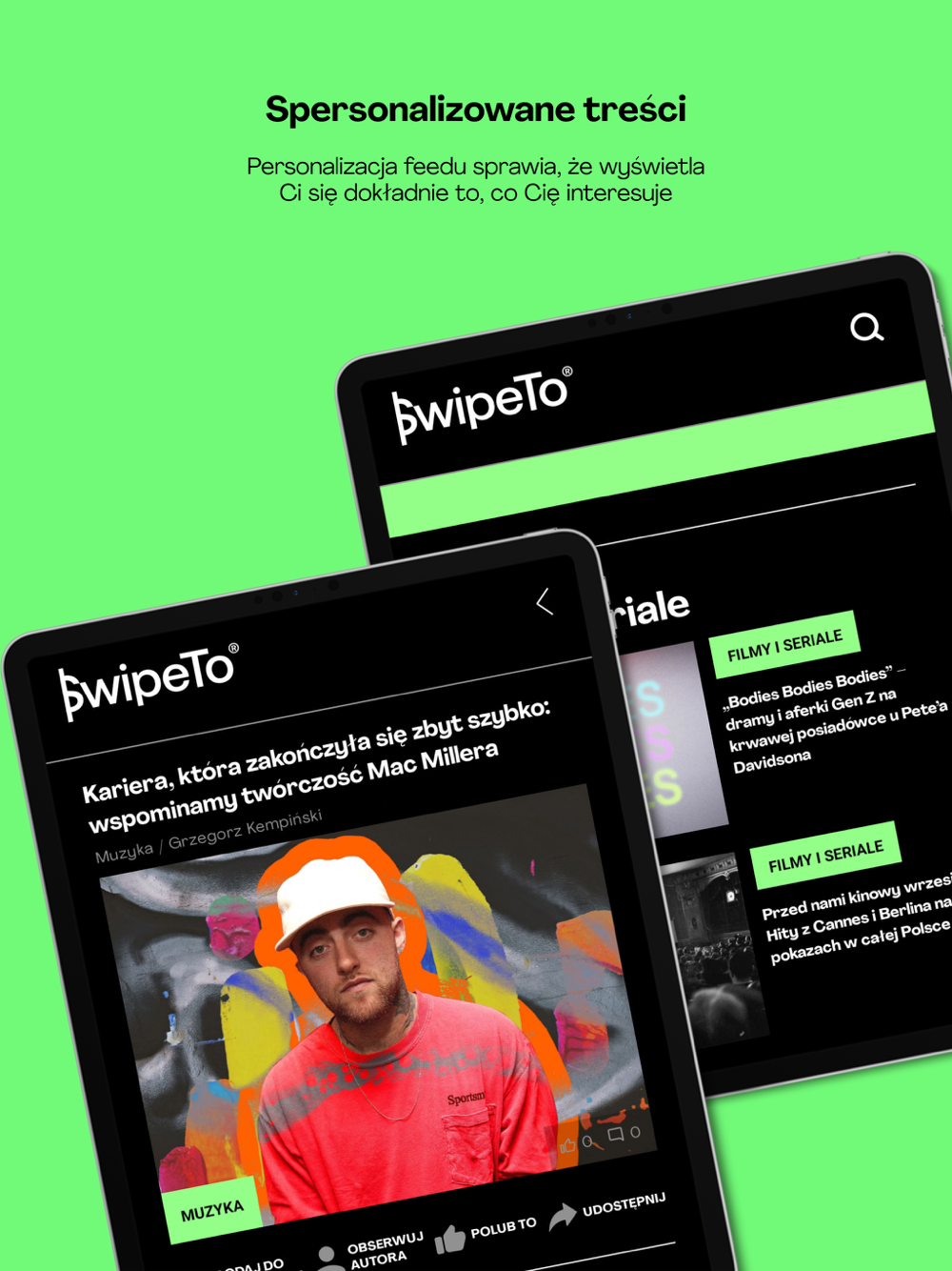 SwipeTo to aplikacja, w której znajdziesz wszystko, co ważne tu i teraz. Newsy. Popkultura. Lifestyle. Muzyka. Filmy. Seriale. Sport. Technologia. Gaming. Ekologia. Sprawy społeczne. Wszystko w formie, jaka pasuje ci najbardziej. Lubisz słuchać? Czeka na Ciebie kilkanaście podcastów. Wolisz czytać? Mamy mnóstwo artykułów, felietonów, analiz i recenzji. Jesteś wzrokowcem? Oglądaj nasze materiały video. Dużo treści, żadnych reklam. Tylko tu i teraz. Ściągnij i sprawdź.