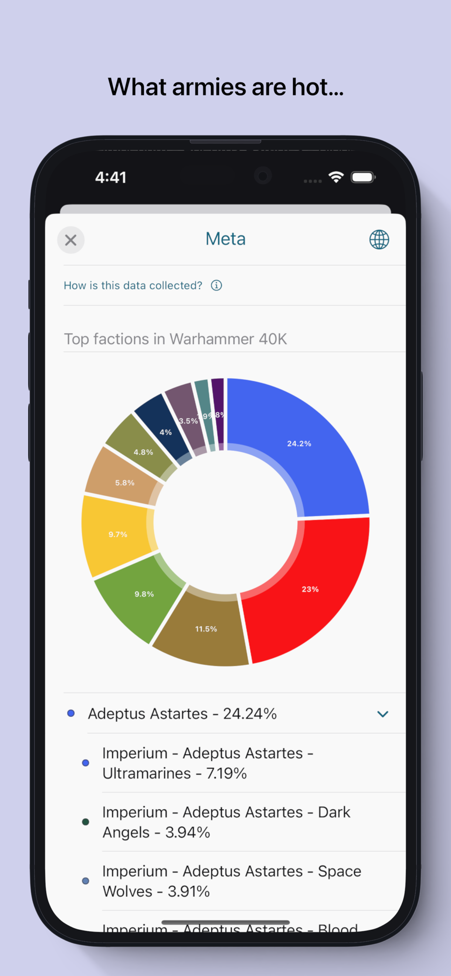 - Generate game system meta reports - which army is being used most these days? What are the top units for my faction and how many do people take?