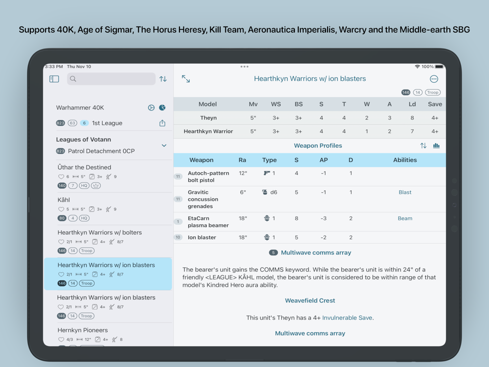 - Supports Warhammer 40K, Warhammer Age of Sigmar, Warhammer Armies Project, The Horus Heresy, Adeptus Titanicus, Aeronautica Imperialis, Battlefleet Gothic, Blood Bowl, Kill Team, Middle-earth: Strategy Battle Game and Warcry
