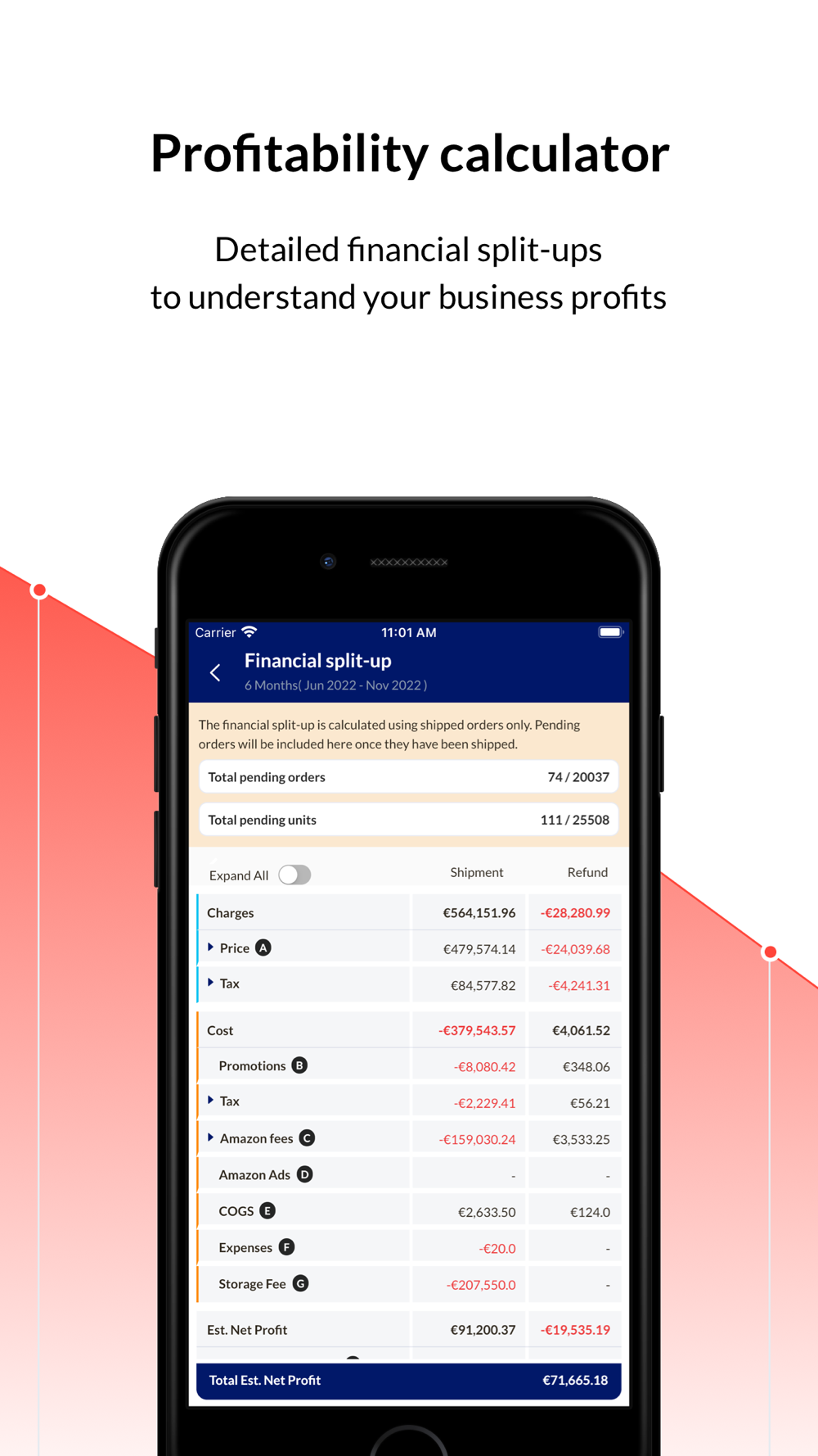 Track the charges and costs of your business to understand the revenue and estimated net profit from your sales. View a detailed split-up of all your costs such as Amazon Fees, Promotions, COGS and even Refunds all in one place.