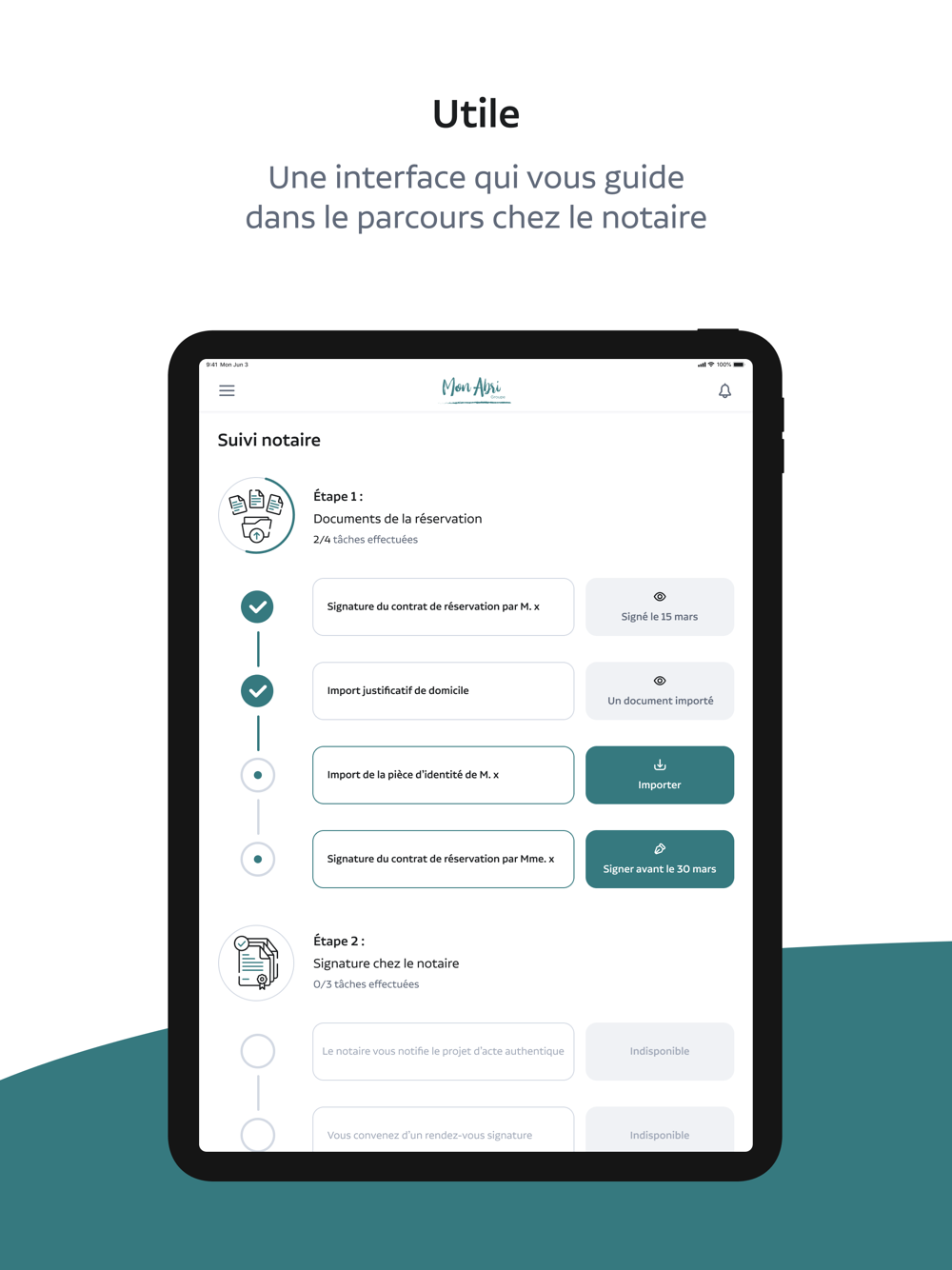 "Mon projet immo" est accessible depuis votre ordinateur et via l'application mobile. Il permet ainsi de gérer votre projet immobilier dés la signature du contrat de réservation. Toutes ces étapes sont désormais dématérialisées. Vous pourrez suivre l'avancement de votre projet grâce à vos identifiants sur "Mon projet immo", et suivre les différentes étapes :