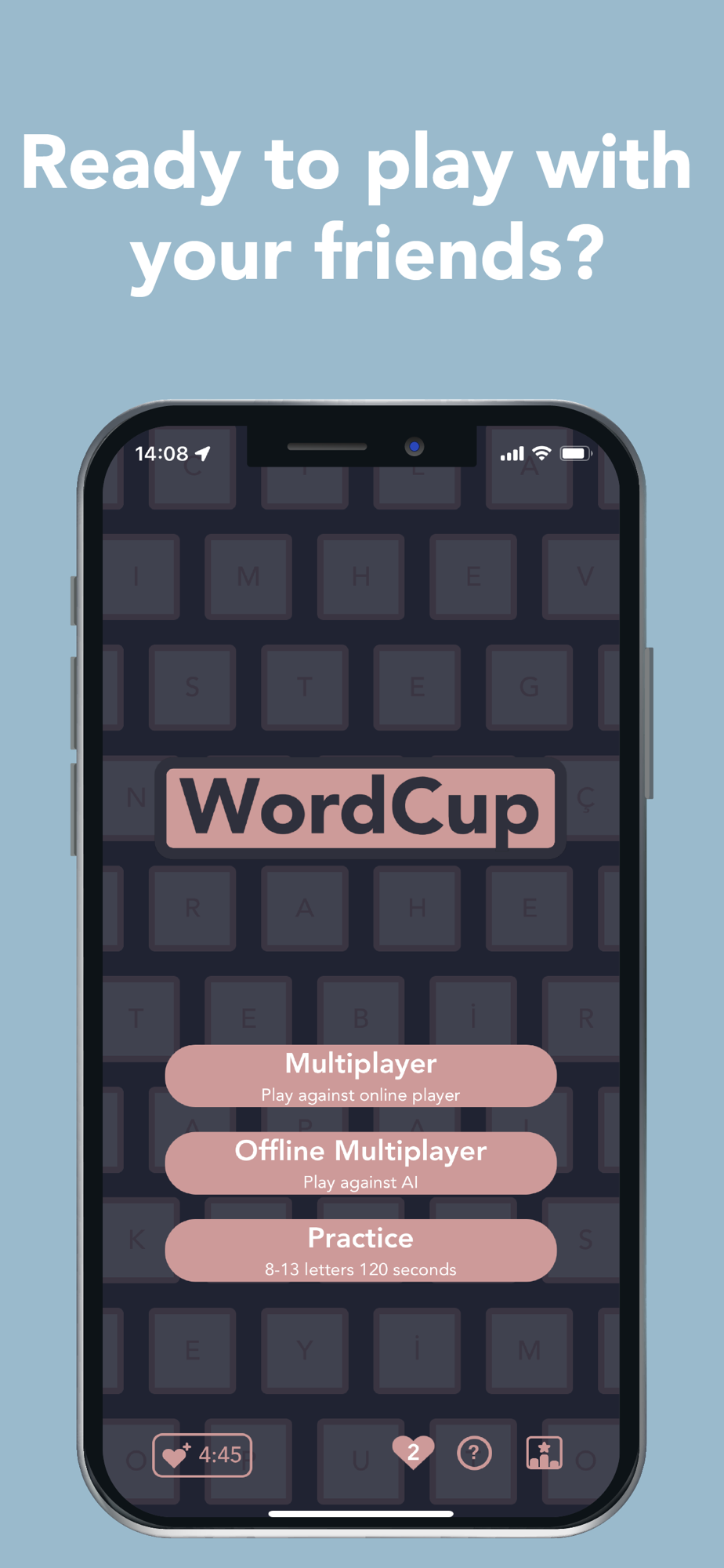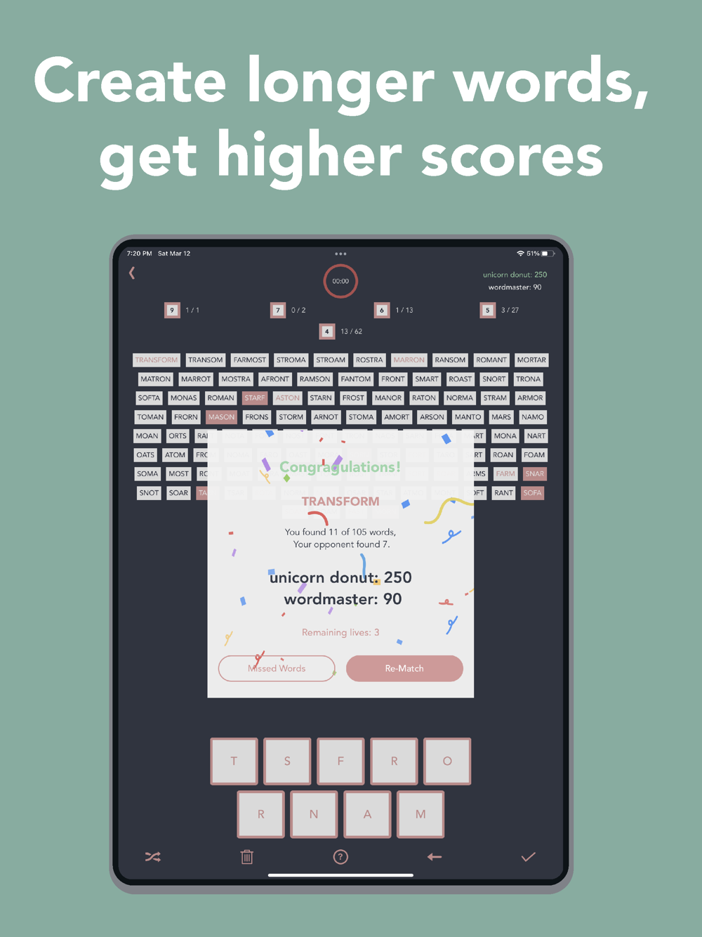 Offline multiplayer: You'll have a smart opponent, `wordmaster`, you'll be competing against them to get the highest score.