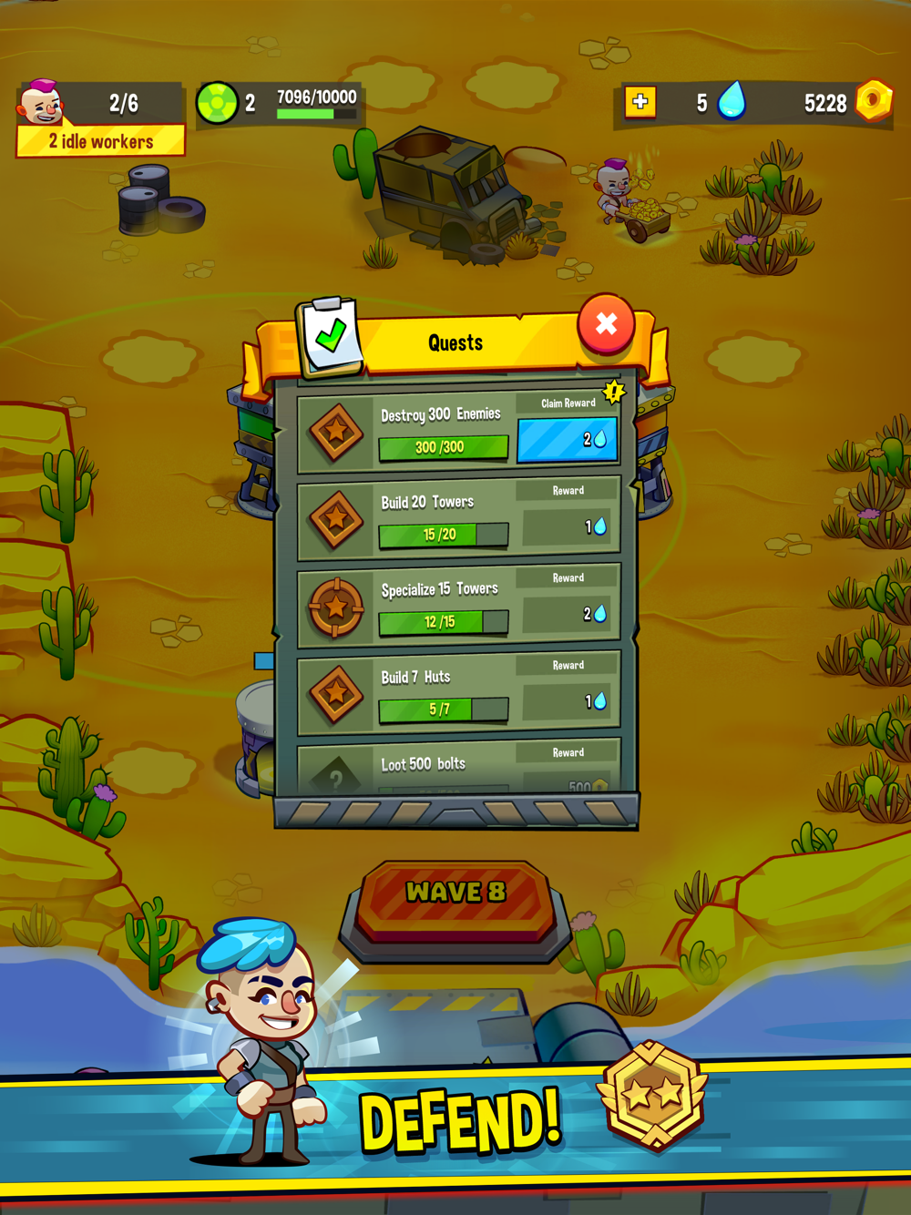 Besides building war towers, this free TD game also has idle tower defense elements as you can create and hire idle workers to collect and store bolts from fallen enemies. Build as many huts as possible, as this is where your workers will store the bolts. Then use the bolts to get more workers and build more towers, you’ll need them in the dangerous tower action waves in the later stages.