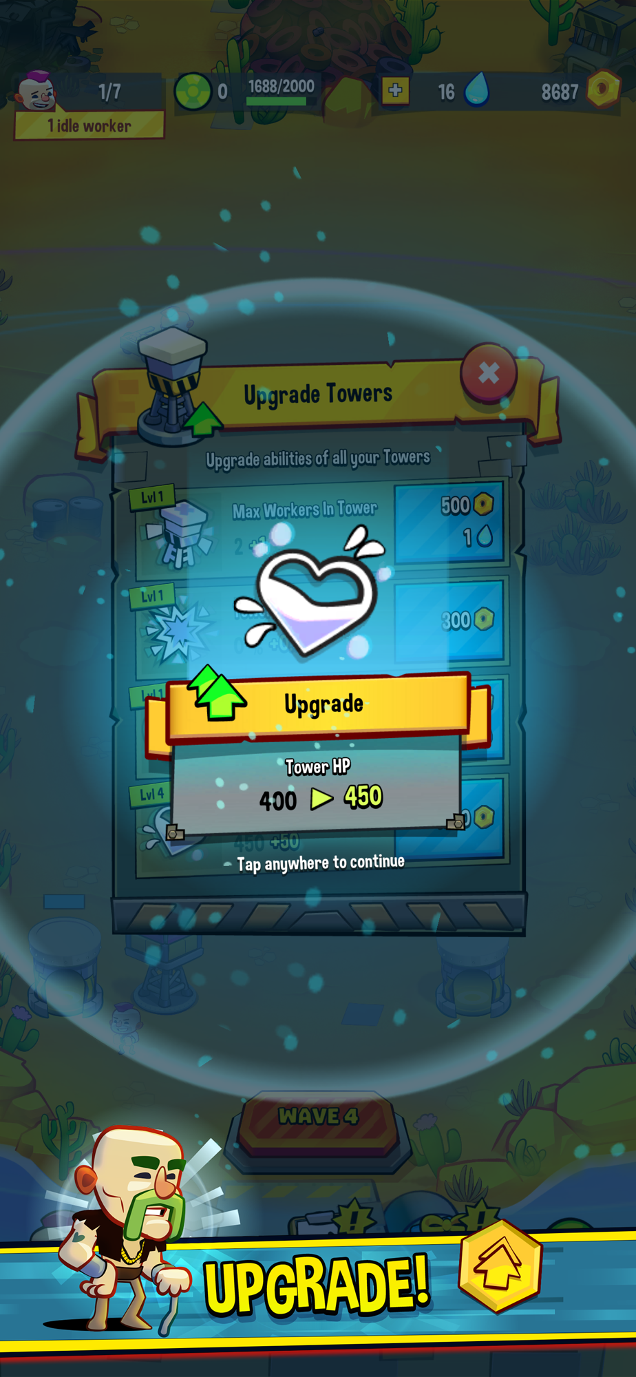 ‣ upgrade max workers in a tower; tower damage, range, HP; increase wall HP
