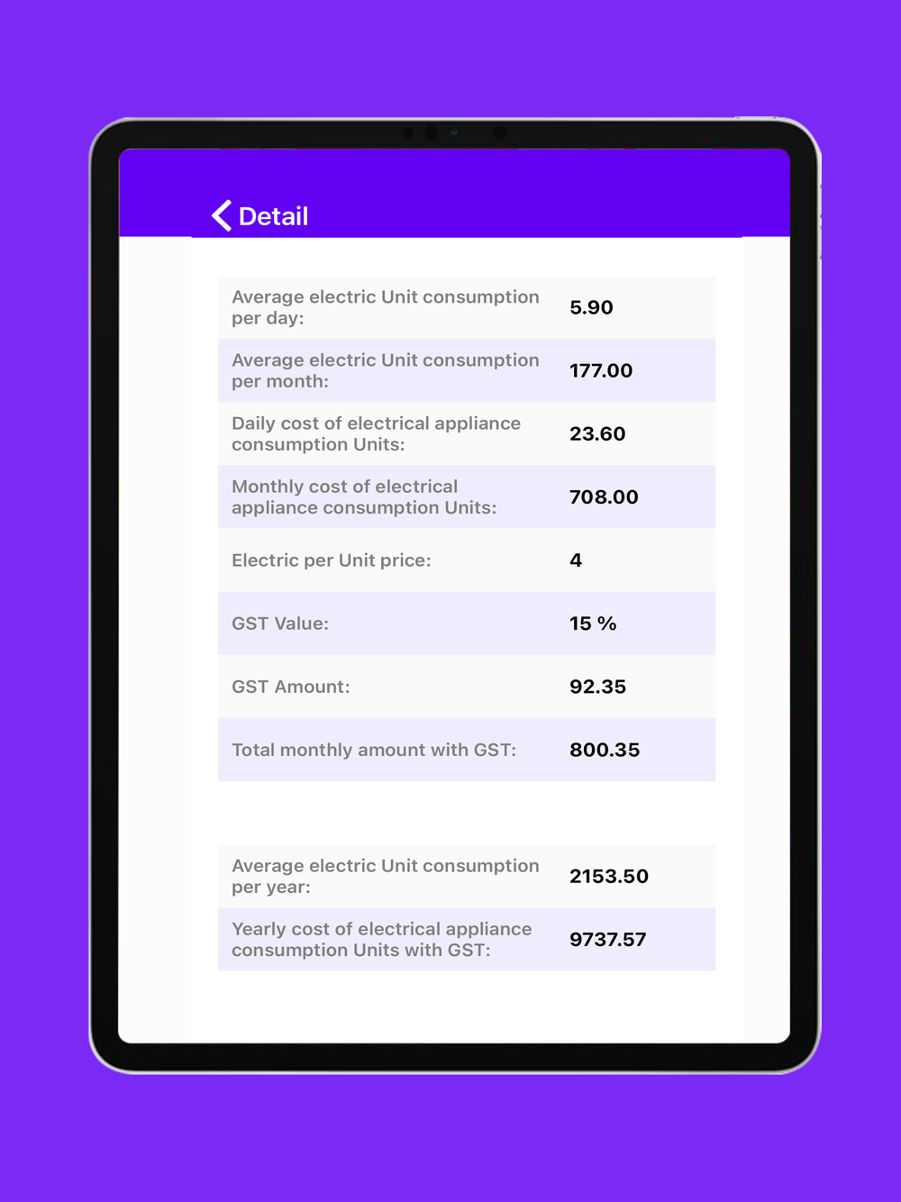 set your electricity per unit price value and general sale tax (GST) according to your country in set values section in the app.