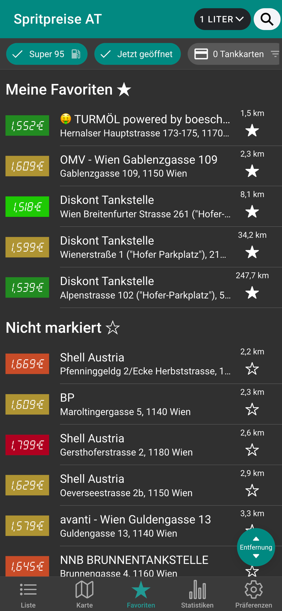 - Über 3000 Tankstellen: Erhalte den kompletten Überblick über alle Tankstellen in ganz Österreich. Einfach mit Sortierungsmöglichkeiten auf Entfernung oder Preis eingrenzen.