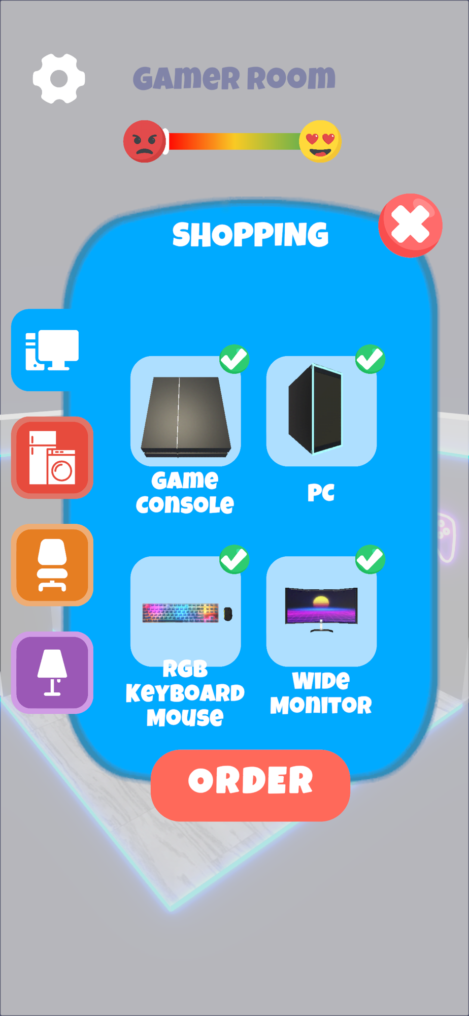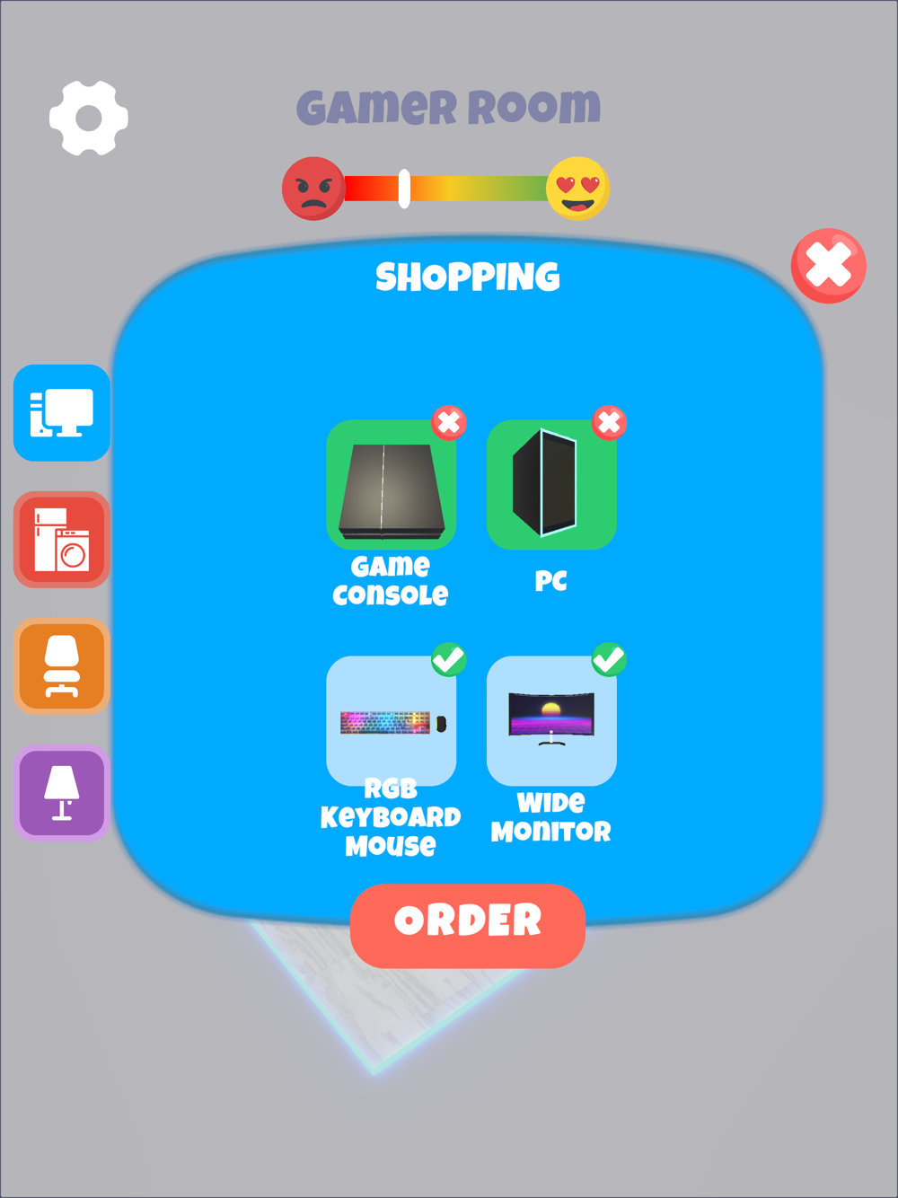 Your client asks you to design a room. Buy items that the customer might like. You can also design a gamer room and even a kitchen!
