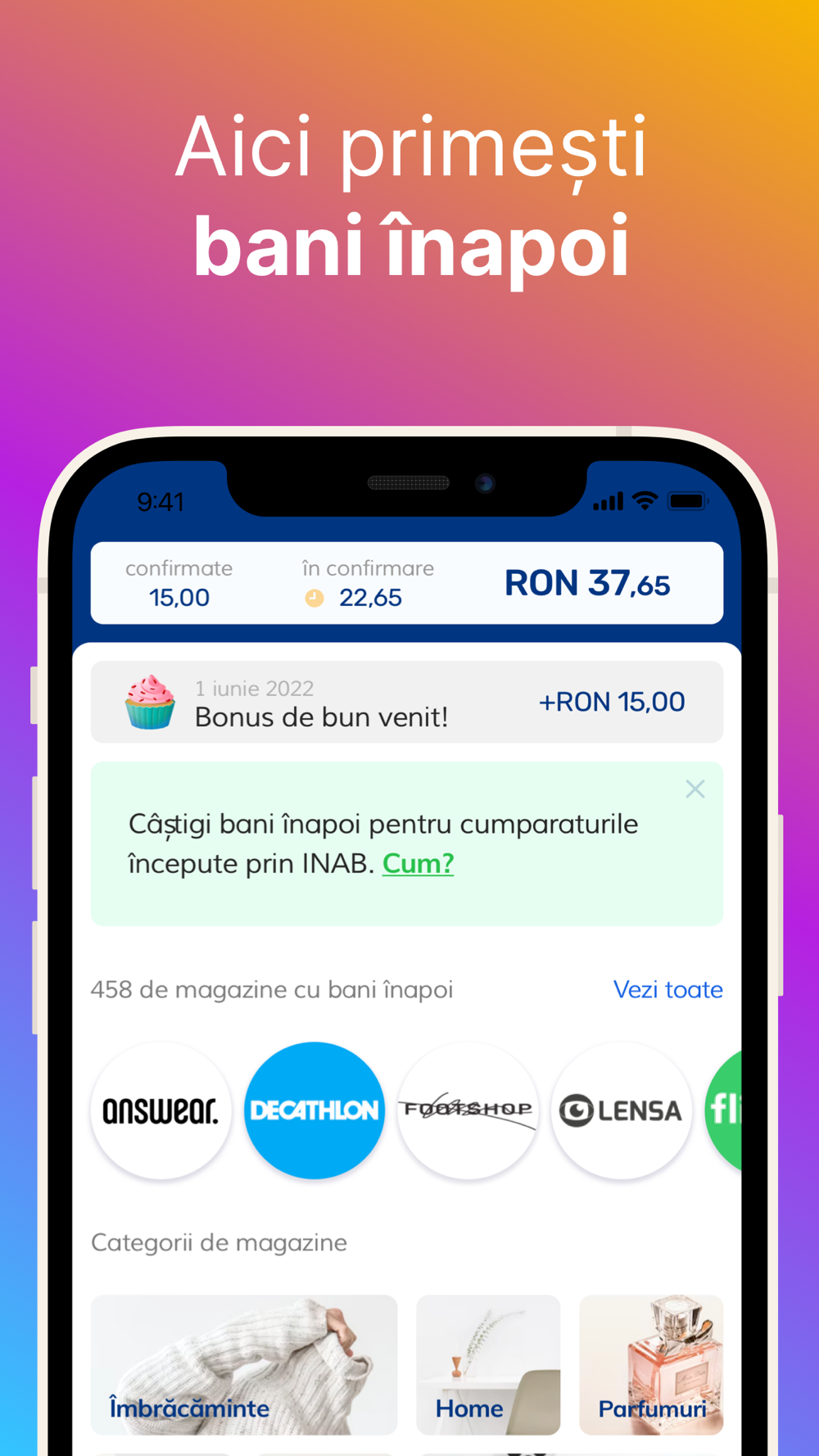 INAB înseamnă Bani înapoi. Deschide oricare magazin din aplicația Bani înapoi și vei primi bani înapoi pentru orice comandă plasată în timpul vizitei tale.